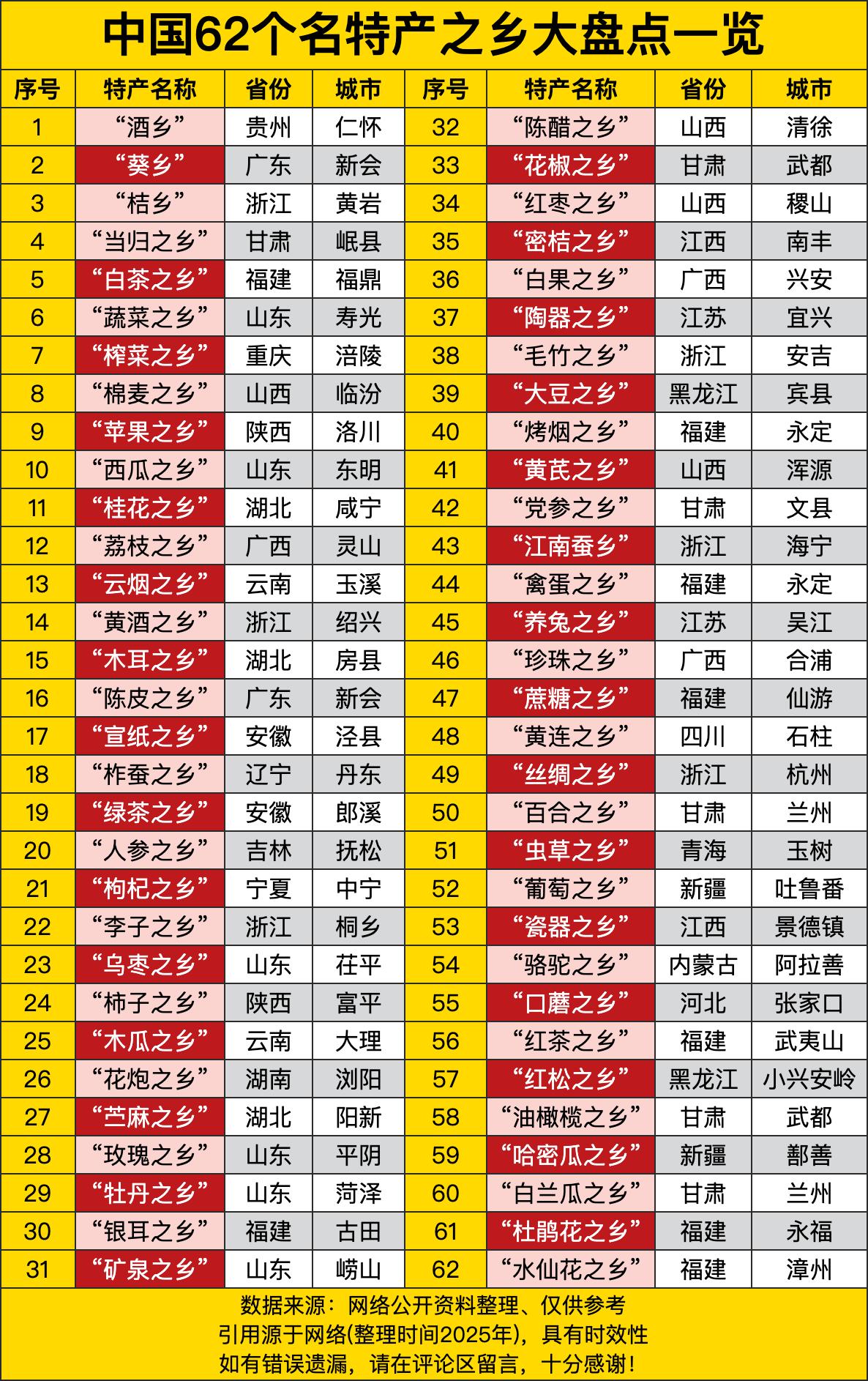 中国这62个名特产之乡,那可真是五花八门、啥都有哇!就说这“酒乡”在贵州仁怀,那茅台可是闻名天下,估计喝上一口,走路都想飘起来。还有浙江黄岩的“桔乡”,一到季节,满大街都是黄澄澄的桔子,看着就诱人,感觉吃一个就能甜到心坎里去啦! 再瞧瞧这些地方,甘肃岷县是“当归之乡”,这当归可是养生好物,说不定当地人随便熬个汤,那营养就杠杠的。而重庆涪陵作为“榨菜之乡”,早上来上一包涪陵榨菜,配着粥,那叫一个舒坦,简直是开启活力一天的小秘诀呀!感觉这些特产都和当地人的生活紧紧绑在一起啦。 咱接着看,山西清徐是“陈醋之乡”,那醋溜白菜要是用这儿的醋做,味道绝了!还有陕西洛川的“苹果之乡”,洛川苹果又大又甜,在市场上那可是抢手货。想想当地漫山遍野的苹果树,果农们丰收的时候,脸上肯定乐开了花,这可都是大自然的馈赠呀! 最后还有好多呢,像江西南丰的“密桔之乡”、广西兴安的“白果之乡”等等。这些名特产之乡就像一个个宝藏之地,藏着数不清的美味和特色。咱没事儿可以多去这些地方逛逛,尝尝当地的特产,感受感受不同地方的风土人情,说不定还能发现更多惊喜哟!