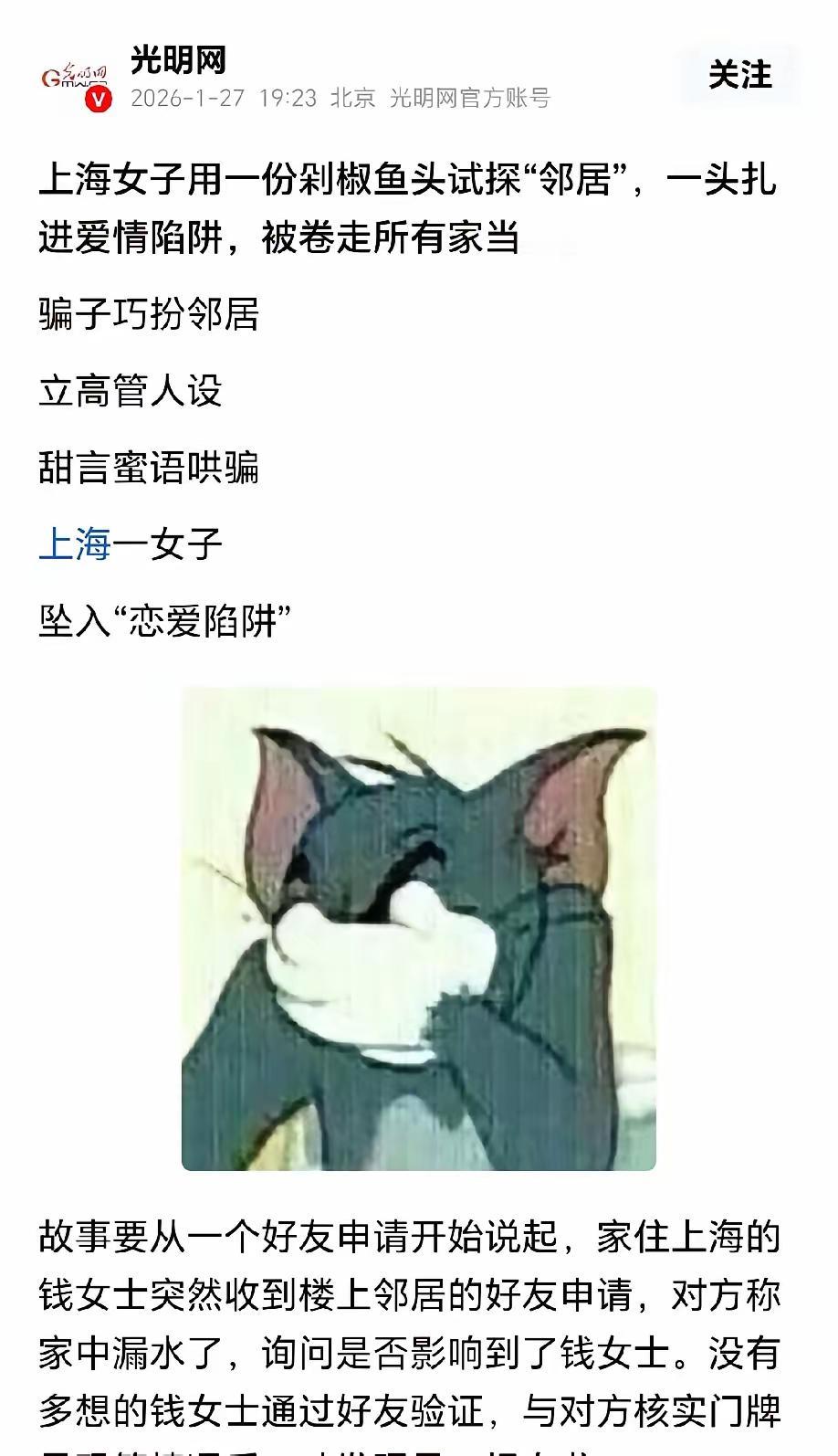 这起案件反映了网络诈骗的狡猾与多变,也提醒我们在网络交往中保持高度警惕。以下是对案件的梳理和几点建议: 案件概述: 受害人:钱女士,四十多岁,生活阅历丰富,但在网络上被人利用信任惯性逐步陷入圈套。 骗子使用的手法: 假扮邻居,谎称家中漏水,建立初步联系。 通过甜言蜜语和小礼物,赢得信任。 提供虚假身份(互联网企业高管),还寄送实物(剁椒鱼头)验证身份。 送手机,打造“专属联系方式”,强化关系。 故意让受害人管理虚假的资金账户,并显示收益,激发投资欲望。 诱导投资基金,短时间内显示“收益”,使受害人放松警惕。 最终以各种借口(运送外卖、转账等)骗取全部积蓄。 诈骗手段分析: 制造“真实”互动,建立假象。 利用“验证”手段增强可信度。 设计“收益”假象,激发受害人入局。 操控虚假资金平台,促使受害人投入大量资金。 以“专线”手机和多重身份设立迷惑层层递进。 利用跑腿软件取外卖照片,制造交易真实性。 防范建议: 谨慎添加陌生人好友:遇到陌生人以“邻居”“高管”等身份接触,务必保持警惕,不盲目相信。 核实身份信息:通过官方渠道确认对方身份,不轻信“验证”手段或小礼物。 注意个人信息安全:避免在网络上泄露家庭住址、详细个人信息。 不轻易转账或投资:遇到任何“高收益”“管理账户”的诱惑,应持谨慎态度,避免盲目投资。 警惕虚假验证方式:例如假寄送礼物、虚假照片等手段,任何“验证”都应通过正式渠道确认。 宣传法律知识和求助渠道:遇到可疑情况及时向公安机关、反诈中心咨询,增强自我保护意识。 警方提醒: 网络诈骗手段不断翻新,要提高警惕。 不轻信陌生人提供的所谓“高端关系”“专业投资”信息。 一旦发现被骗,要第一时间保存证据并报警,争取挽回损失。 希望此案件能引起大家的重视,增强防范意识,避免类似悲剧再次发生。诈骗 网络陷阱诈骗 骗局的误区