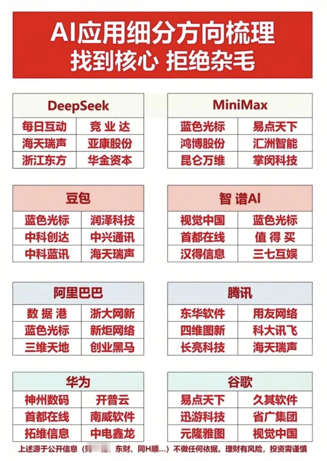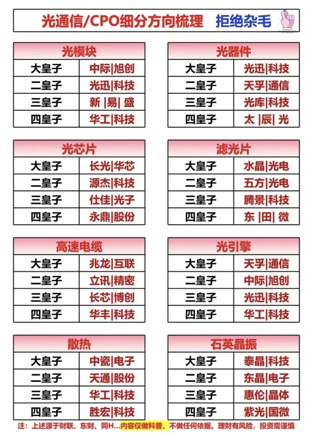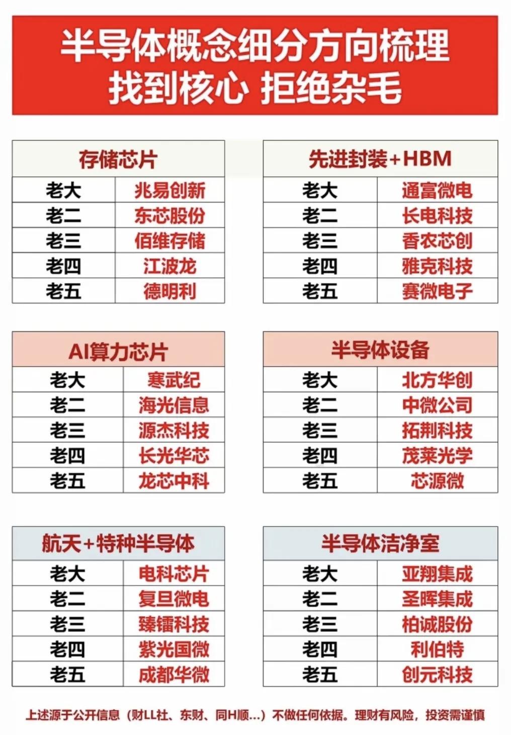 三大硬核赛道核心标的全梳理!半导体+AI应用+光通信精准卡位…… 半导体投资逻辑:国产替代是当前最核心的驱动力。预计未来3-5年,国内半导体设备材料的国产化率将从目前的20%-30%提升至50%以上。(龙头代表通富微电、北方华创、兆易创新) AI应用投资逻辑:AI大模型的技术迭代与商业化落地是主线。2026年将是AI应用的“落地大年”,To B端的AI服务、To C端的AI娱乐场景有望快速起量。(行业代表:易点天下、蓝色光标) CPO光通信投资逻辑:算力基建的“刚需”支撑。全球AI算力中心的爆发式建设,直接拉动了光模块、光芯片、光引擎等核心部件的需求。(行业龙头代表:中兴通讯、光迅科技等等) 投资有风险,决策需理性。以上仅为行业风险梳理,不构成具体投资建议。