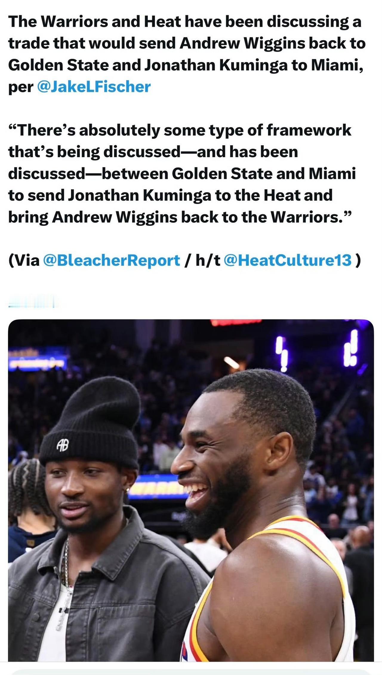 据记者Jake Fischer报道,勇士和热火正在讨论一笔交易,打算让威金斯回到勇士,同时把库明加送到热火: “勇士和热火之间确实已经有了初步的交易框架,并且已经讨论了一段时间,内容就是这两人互换。”