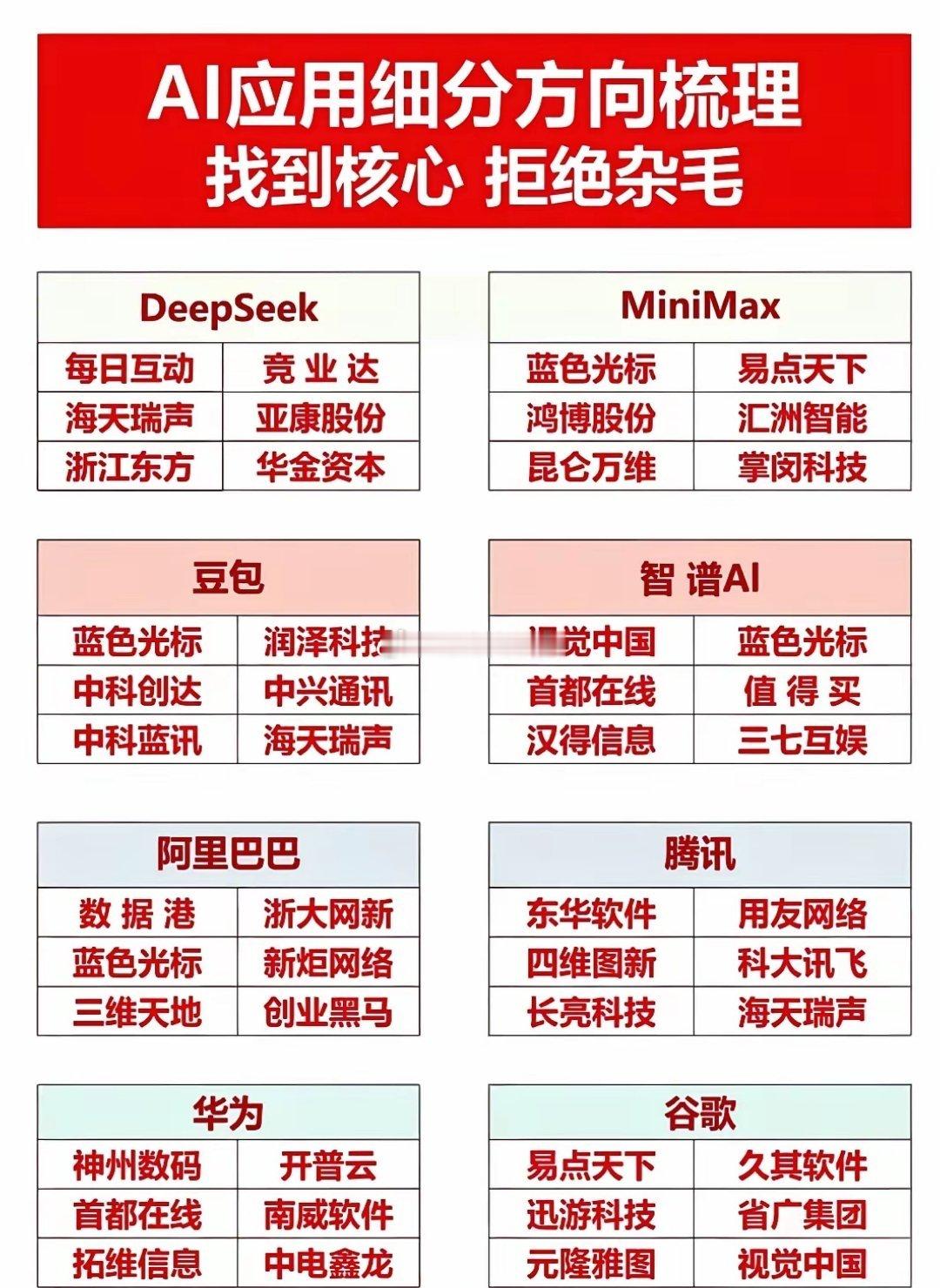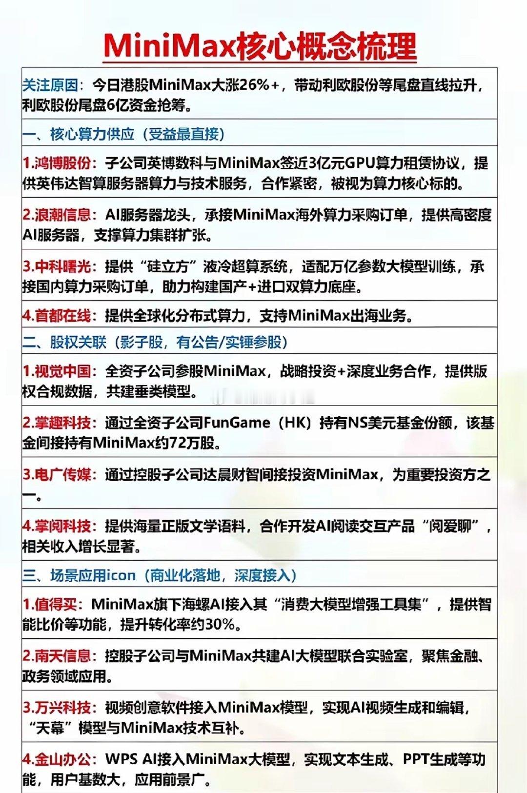🔥MiniMax港股暴涨26%+引爆A股算力行情!利欧股份尾盘6亿资金疯抢,这条产业链全梳理来了,拒绝杂毛AI应用核心龙头梳理!MiniMax是国内快速崛起的AI大模型公司,旗下的「海螺AI」等产品商业化落地进展迅速,其合作伙伴关系公司有鸿博股份、蓝色光标、浪潮信息等等。1月27日,DeepSeek发布V3.2-Exp与V3.2-Speciale两款模型并开源,2026年2月将推V4。相关概念龙头代表有每日互动、亚康股份、竞业达等等。豆包AI2026央视春晚独家AI合作伙伴,火山引擎+豆包深度参与创作、互动、分发全流程,国家级曝光催化商业化。相关概念龙头代表有润泽科技、中兴通讯等等。理财有风险入市需谨慎资料取材网络仅供参考不能作为投资依据!