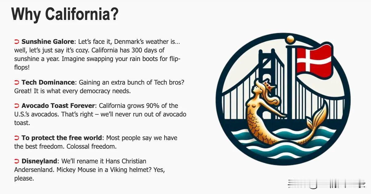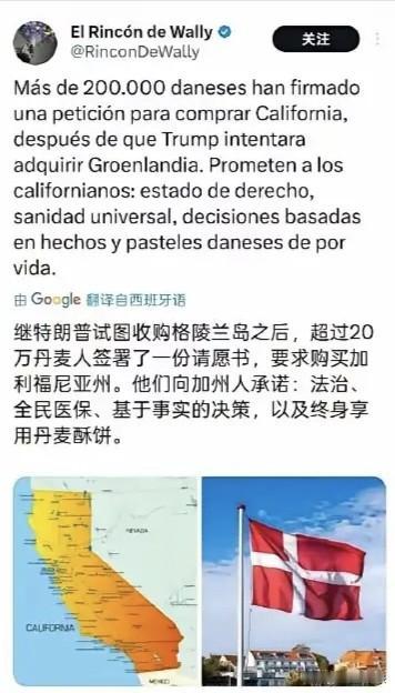 30万人签名支持丹麦买下美国加州并改名“新丹麦” 正当特朗普对格陵兰岛磨刀霍霍的时候,丹麦民众出手了。特朗普或许没有想到,他盯上了格陵兰岛,而丹麦人也瞄上了加州。 1月25号,美国《新闻周刊》报道,一个丹麦化运动Denmarkification网站消息,为了还击美国的威胁,近30万网民参与了一份名为“支持丹麦买下美国加州”的联署。 这个这个联署网站名为“丹麦化运动,让加州再次伟大”,其实就是专门对应特朗普夺取格陵兰岛而新近设立的。 据悉,最先提出这一创意的是瑞士网友泽维尔·杜瓦特。“丹麦化运动”希望用这一滑稽的方式凸显美国威胁夺取格陵兰岛的荒谬。 也就是以牙还牙,以眼还眼。让特朗普也清楚自己的痛处。 该网站的目标是争取获得50万人在线联署签名,目前已有超过30万人次参与了联署。 丹麦网友针锋相对地提出,将向美国开出1万亿美元的报价购买加州,加州被丹麦“购买”后,此地将更名为“新丹麦”。 此前,有美国学者提出用1万亿美元购买格陵兰岛。 丹麦网友的提议得到了国际社会广大网友的支持,他们认为美国就是强盗,所以就要用强盗逻辑对付特朗普。