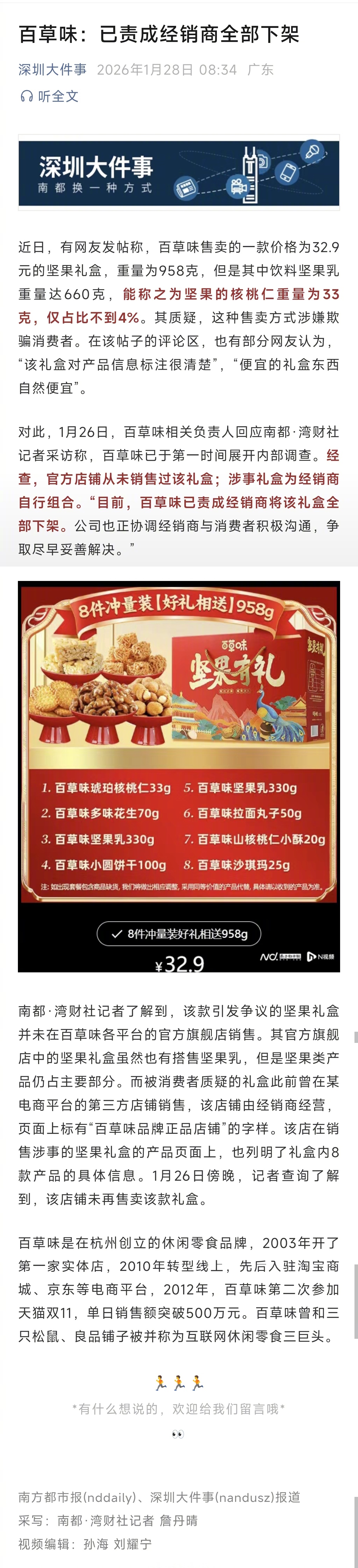 【#百草味回应4%坚果礼盒争议#:涉事礼盒为经销商自行组合】近日,有网友发帖称,百草味售卖的一款价格为32.9元的坚果礼盒,重量为958克,但是其中饮料坚果乳重量达660克,能称之为坚果的核桃仁重量为33克,仅占比不到4%。其质疑,这种售卖方式涉嫌欺骗消费者。在该帖子的评论区,也有部分网友认为,“该礼盒对产品信息标注很清楚”,“便宜的礼盒东西自然便宜”。对此,1月26日,百草味相关负责人回应南都·湾财社记者采访称,百草味已于第一时间展开内部调查。经查,官方店铺从未销售过该礼盒;涉事礼盒为经销商自行组合。“目前,百草味已责成经销商将该礼盒全部下架。公司也正协调经销商与消费者积极沟通,争取尽早妥善解决。”网页链接