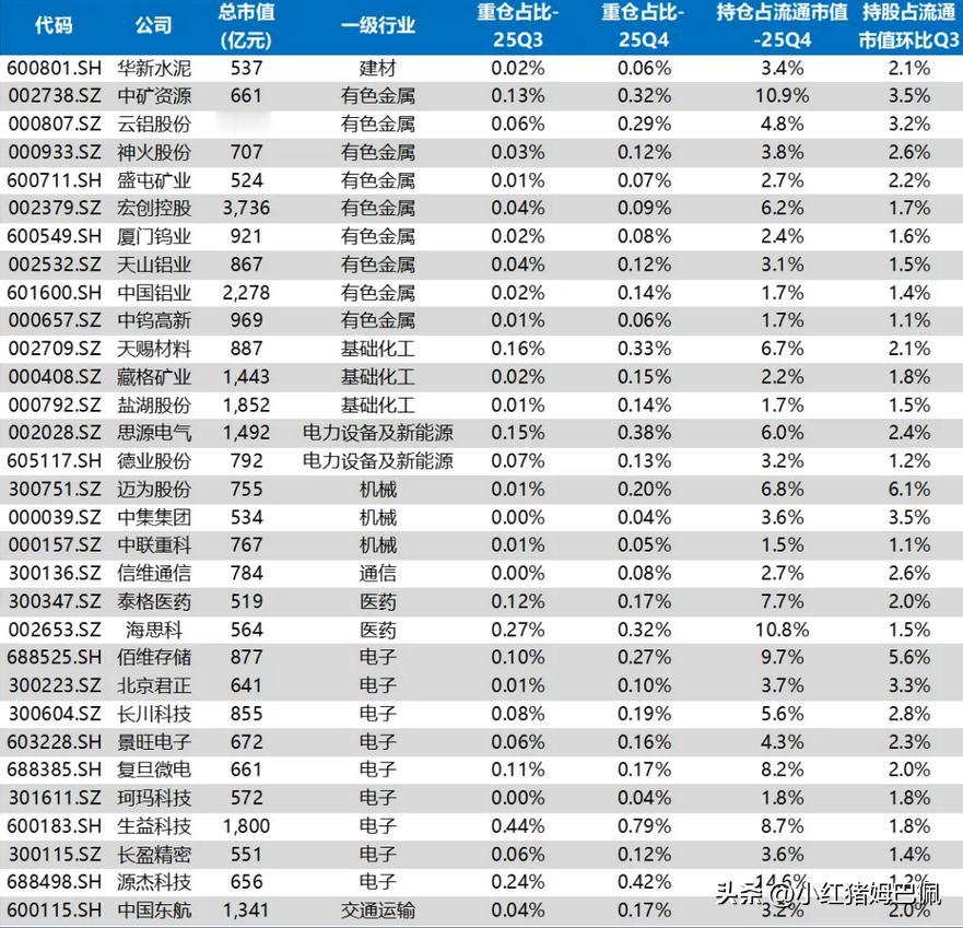 根据公募基金发布的四季报,财通证券近期整理了环比2025年三季度公募基金持仓提升的权重个股。 看这样的汇总信息,一方面是了解公募基金在四季度加仓了哪些标的,另一方面可以看看公募基金的加仓主要集中在哪些行业,从表格中来看,有色金属、化工、电力、电子、机械设备相对较多。