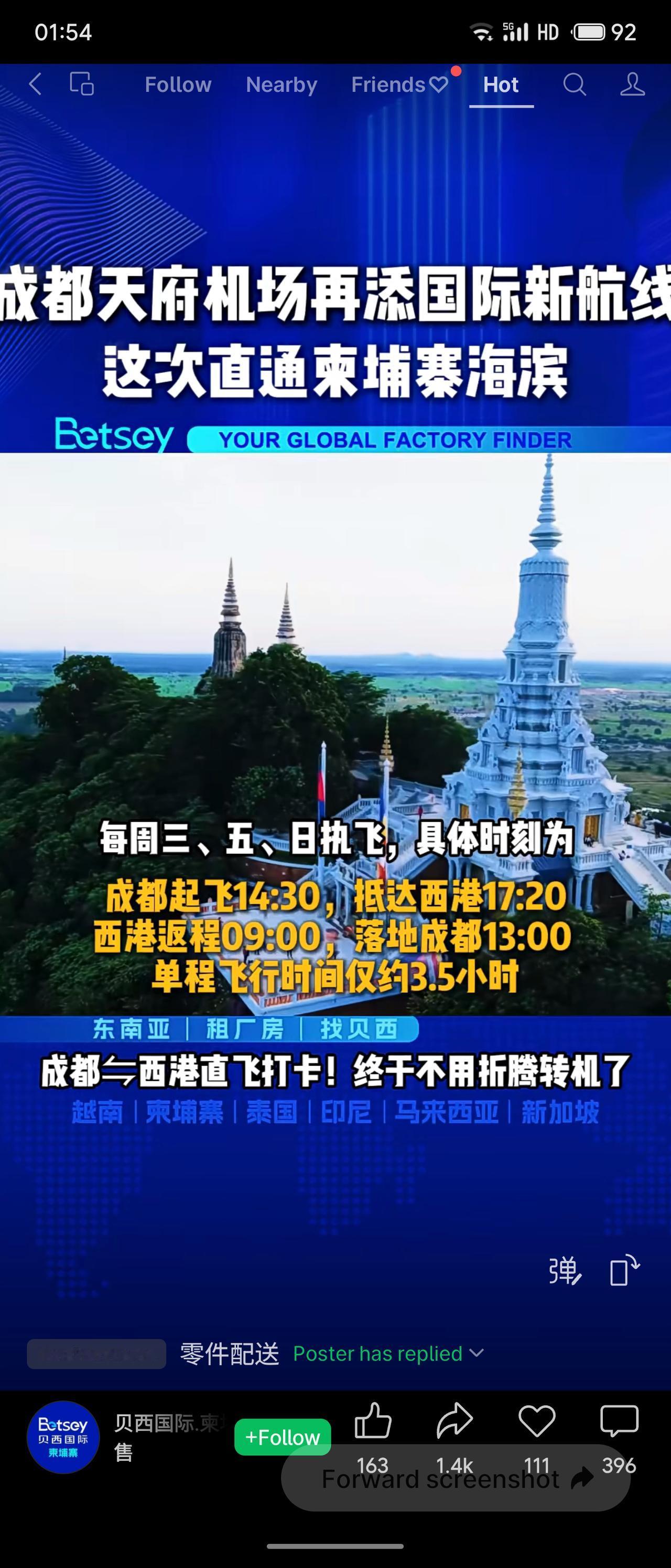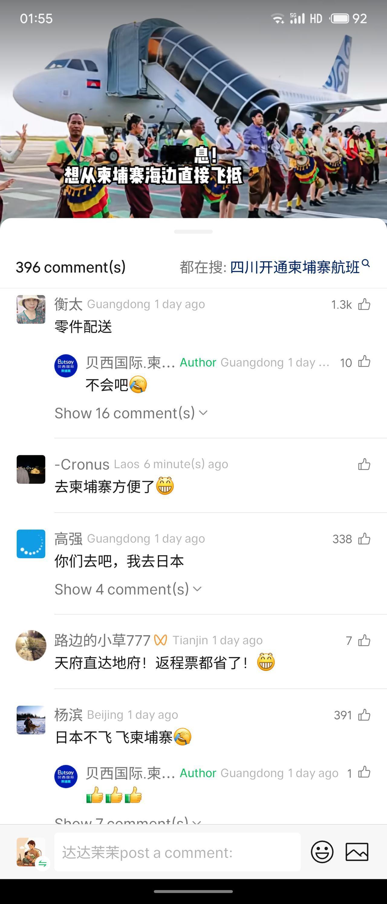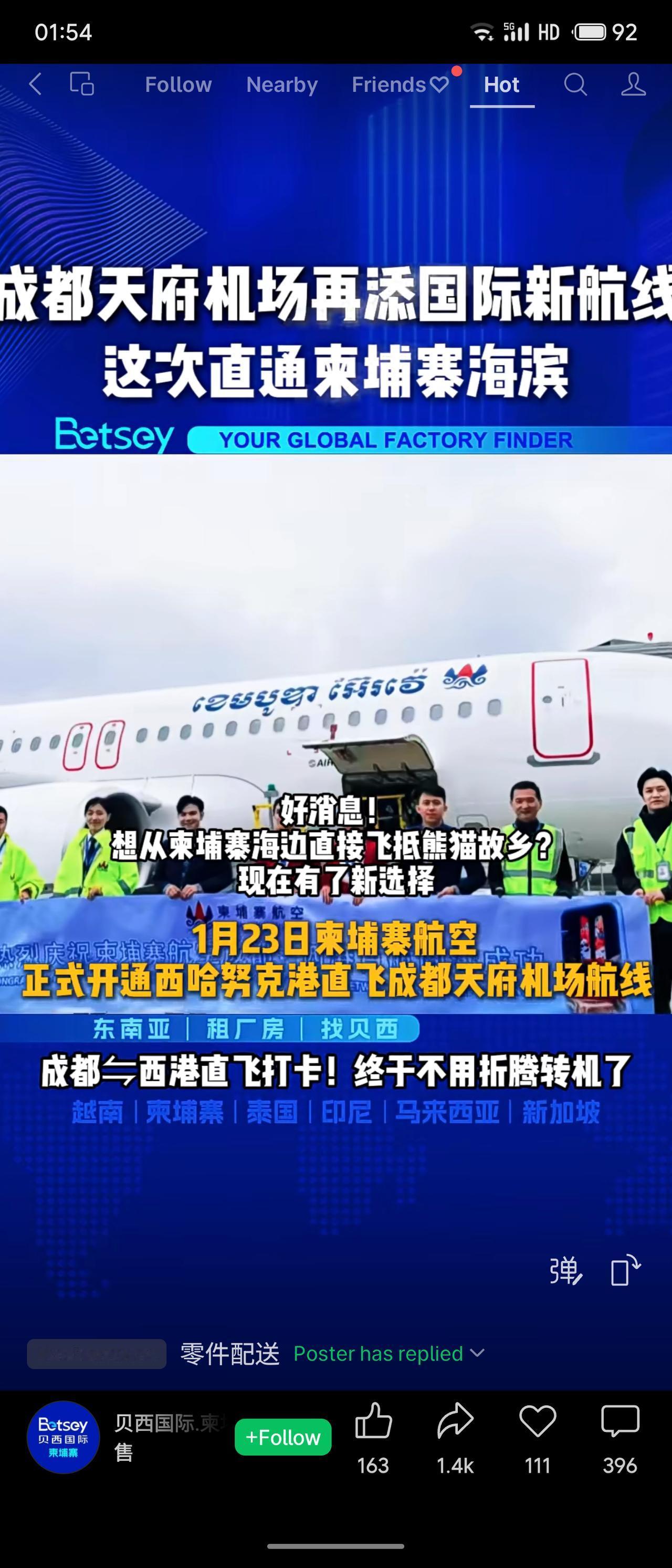 成都天府机场于1月23日开通直飞柬埔寨西哈努克港的航线,每周三、五、日执飞,单程约3.5小时。这不仅是便捷的旅游通道,也强化了成都作为西部国际航空枢纽的地位,有利于促进中柬经贸与人员往来。网友热评“零件配送”燥翻评论区。