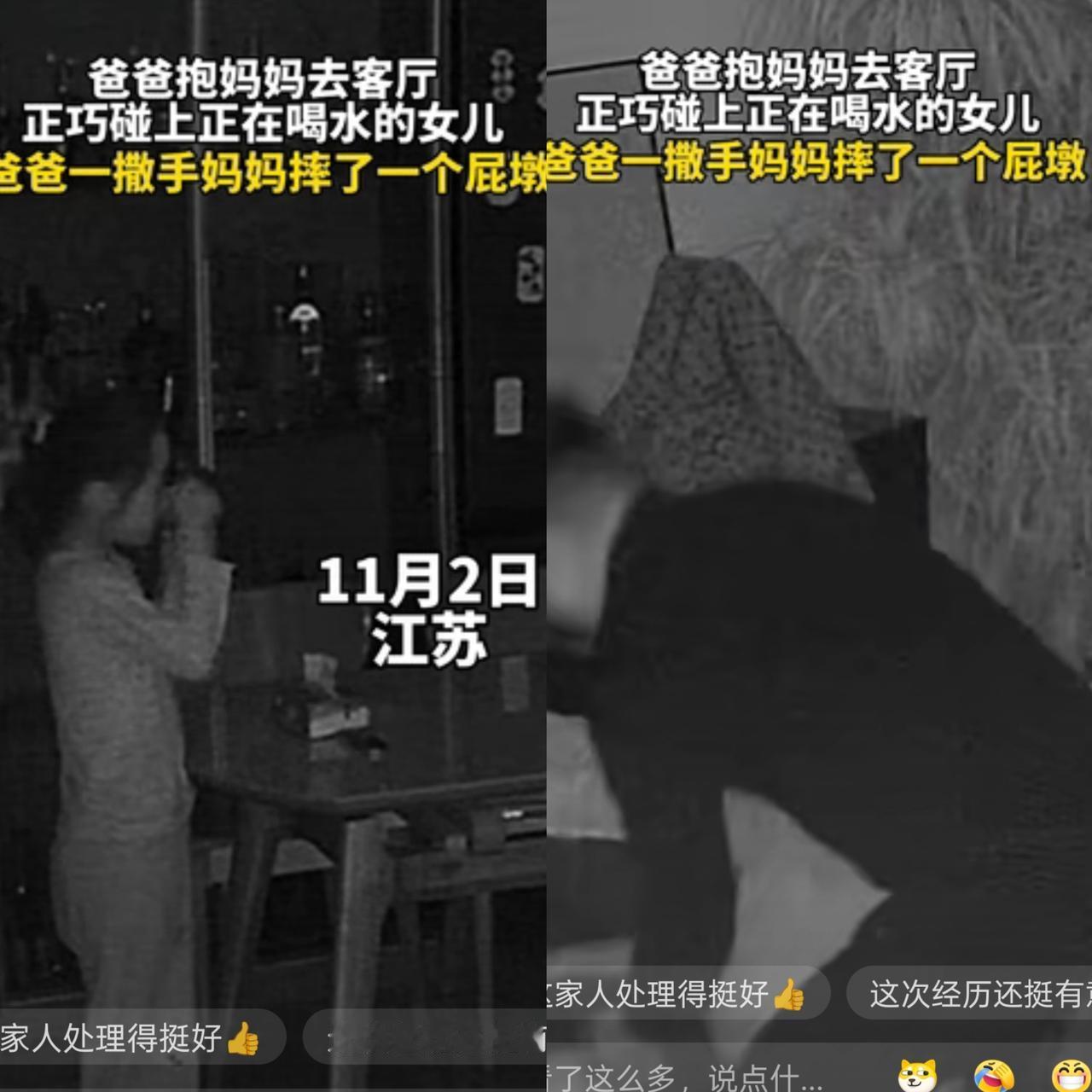 这事儿真是一辈子都解释不清了!江苏这段居家监控视频直接冲上热搜,看得我老脸一红又忍不住想笑。 夜里熄灯本该是各回各屋的安静时刻,谁成想这对夫妻为了不吵醒女儿,特意转战客厅。 爸爸大概是浪漫上头,一个公主抱就往沙发冲,结果在黑漆漆的客厅迎面撞上出来接水的女儿。 四目相对的瞬间,爸爸手一抖,妈妈直接摔了个“屁股蹲”,这画面的尴尬指数简直捅破了天花板。 很多人把这当成个笑话看,但我却从中读出了一种当代家庭特有的“卑微式浪漫”。 人到中年,白天围着生计转,晚上围着孩子转,夫妻俩想温存一下还得像“地下工作者”一样打游击。 这一摔,摔出的是中年夫妻对二人世界的卑微渴望。其实,这真没什么好丢人的,反倒说明这个家很有爱。 很多家庭有了孩子后,夫妻关系就降级成了“室友”,像这种半夜还想抱抱的腻歪劲儿,反而是一种感情保鲜的证明。 不过,评论区里那些替孩子尴尬的网友也点到了痛点。虽说家里是私人领地,但孩子毕竟不是摆设。 在他们眼里,父母是权威和榜样,突然撞见这种“失控”的亲密,确实容易让孩子手足无措。 好在视频里的女儿很淡定,第二天照常上学,这心理素质也是没谁了。但这一杯水也确实给大人提了醒:亲密有理,但分寸感不能丢。 家里有了娃,浪漫也得讲究个“战术布局”,别让本该甜蜜的瞬间变成了大型社死现场。 我觉得这种尴尬其实是家庭教育的一个切入口。父母恩爱是给孩子最好的礼物,但适当的界限感能让这种爱更体面。 妈妈那块青紫估计过两天就好,但爸爸那张红透的脸,大概能让他在未来几年里彻底学会“低调行事”。 其实生活就是这样,鸡飞狗跳里藏着甜,尴尬过后,只要一家人能心照不宣地把分寸理顺,反而能多出几分烟火气的温情。 要是你遇到这种“撞破天”的尴尬瞬间,你会怎么处理呢?评论区里分享一下你的“社死”经历,咱们一起乐呵乐呵。