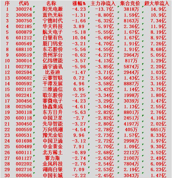 1月28日开盘45分钟,主力“卖出的 ”30名单! 阳光电源:净流入 -13.7亿元 蓝色光标:净流入 -8.80亿元 宁德时代:净流入 -6.32亿元 华天科技:净流入 -5.97亿元 航天电子:净流入 -5.55亿元