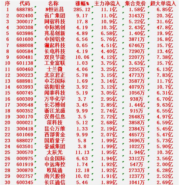 1月28日开盘45分钟,主力资金“买入的 ”的30名单一览! N恒运昌:净流入 11.1亿元 省广集团:净流入 11.0亿元 网宿科技:净流入 10.9亿元 中际旭创:净流入 10.3亿元 兆易创新:净流入 6.58亿元