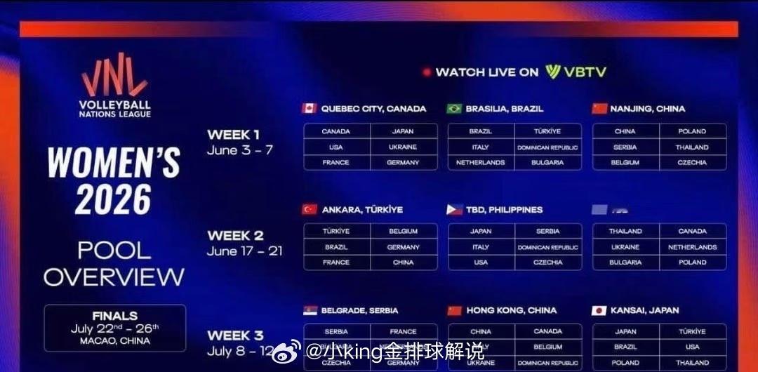 2026年世界女排联赛(VNL)中国女排分站赛城市:第一周6月3日-6月7日中国南京站🇨🇳中国🇨🇳 塞尔维亚🇷🇸 比利时🇧🇪 波兰🇵🇱 泰国🇹🇭 捷克🇨🇿第二周6月17日-6月12日土耳其安卡拉站🇹🇷土耳其🇹🇷 巴西🇧🇷 法国🇫🇷 比利时🇧🇪 德国🇩🇪 中国🇨🇳第三周7月8日-7月21日中国香港站🇨🇳中国🇨🇳 意大利🇮🇹 乌克兰🇺🇦 加拿大🇨🇦 比利时🇧🇪 多米尼加🇩🇴总决赛:7月22日-26日中国澳门站🇨🇳【对于球迷观赛都是好时间,一起来为中国女排加油吧!分站赛不碰日本】中国女排世界女排联赛世界排坛资讯