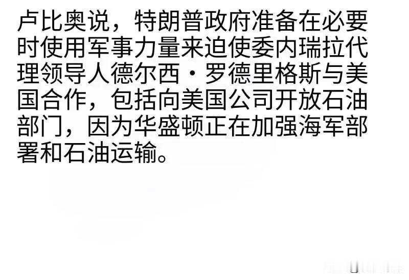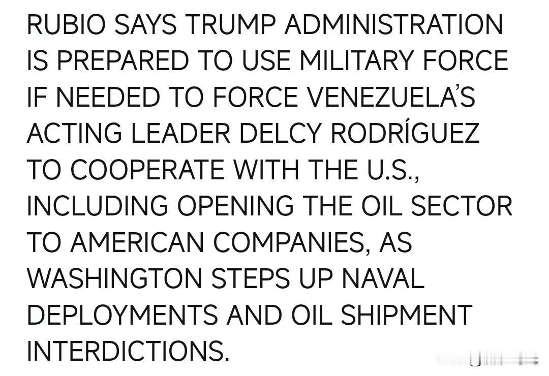 美国国务卿鲁比奥表示,特朗普政府已做好准备,如有必要,将动用武力迫使委内瑞拉代理领导人德尔西·罗德里格斯与美国合作,包括向美国公司开放石油行业。与此同时,华盛顿正在加强海军部署和石油运输拦截。