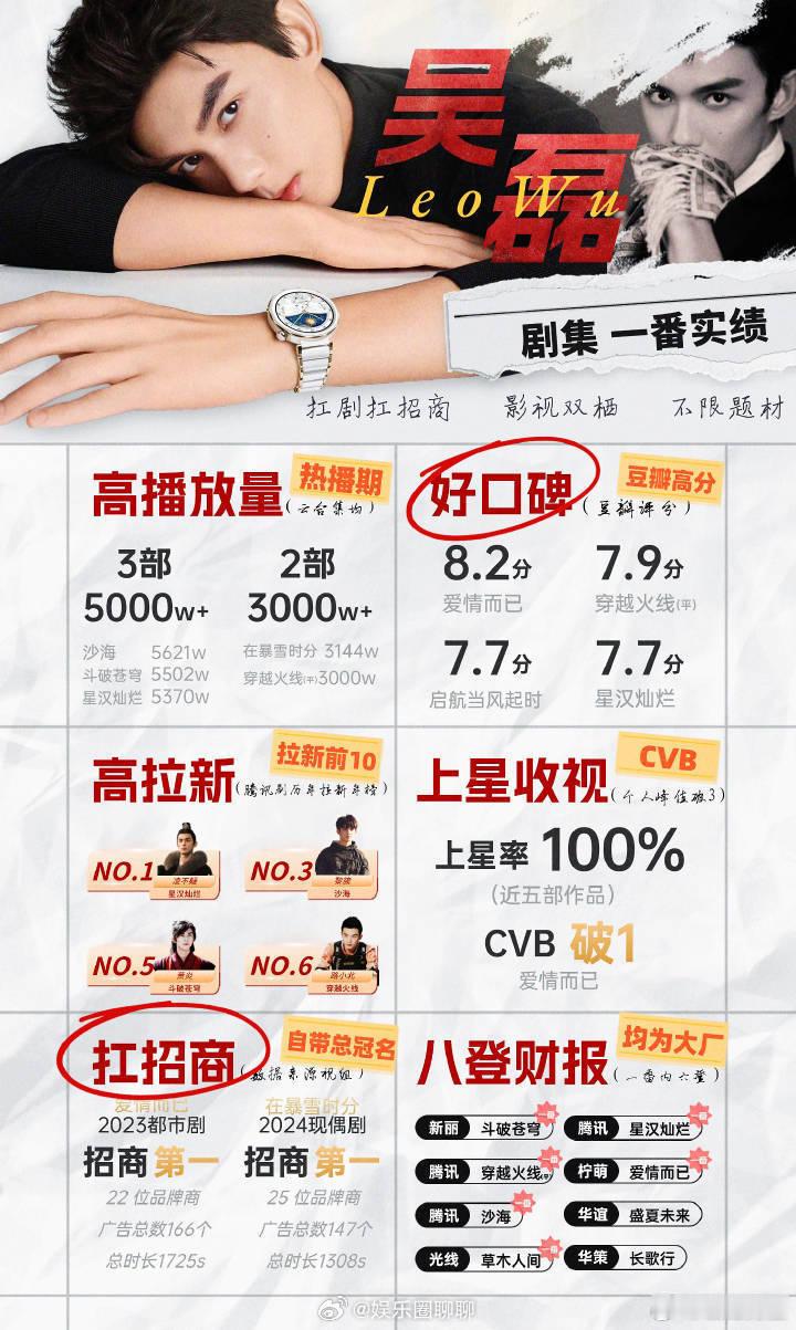 吴磊腾讯实绩盘点 腾讯视频代言人吴磊官宣,磊磊始终保持着对表演的热爱和执着,好演员的路也会越走越远,腾讯视频代言人吴磊期待吴磊带来更多的惊喜!