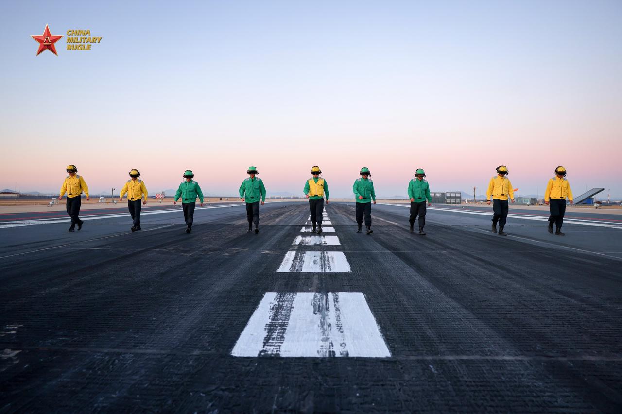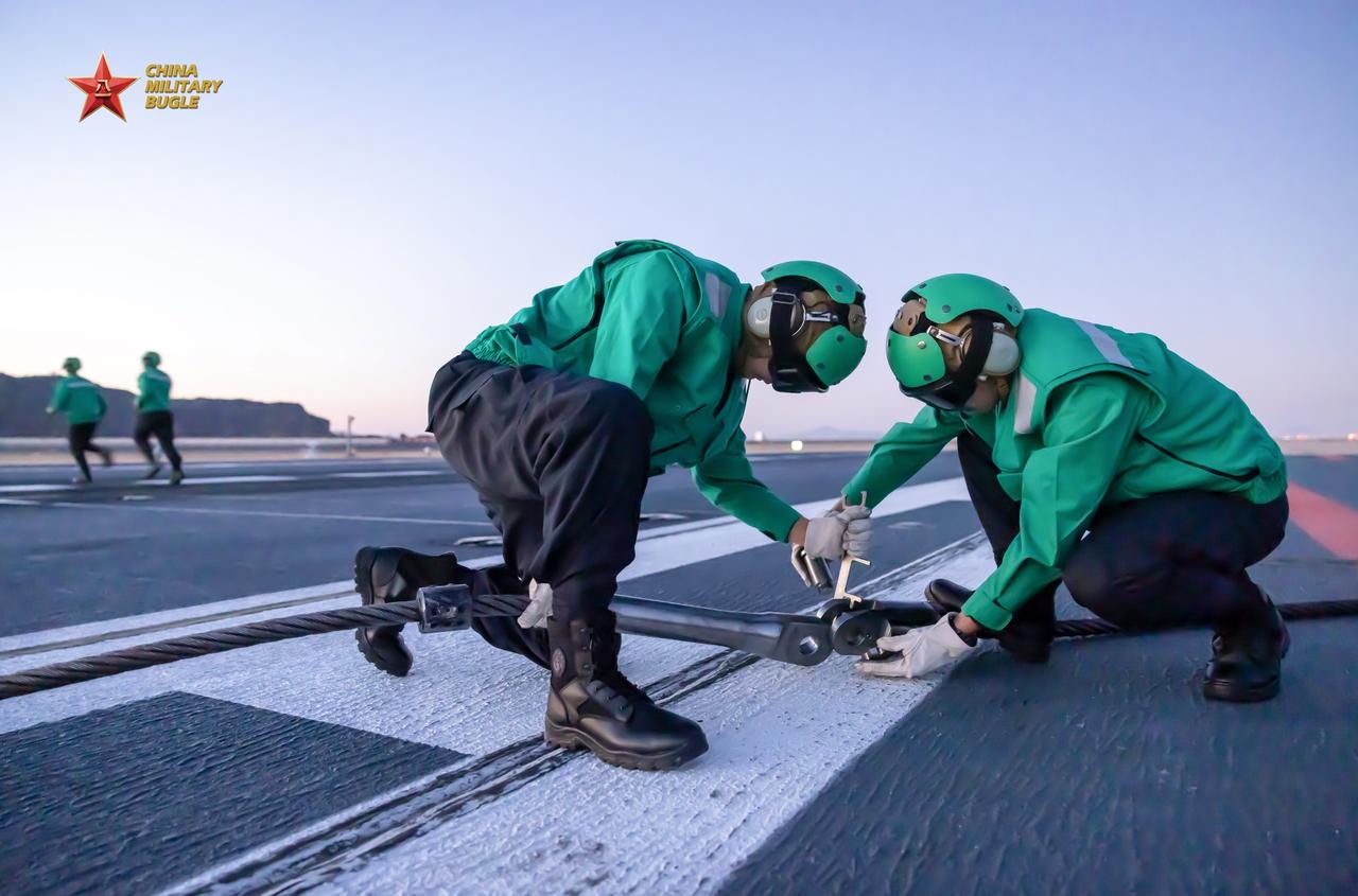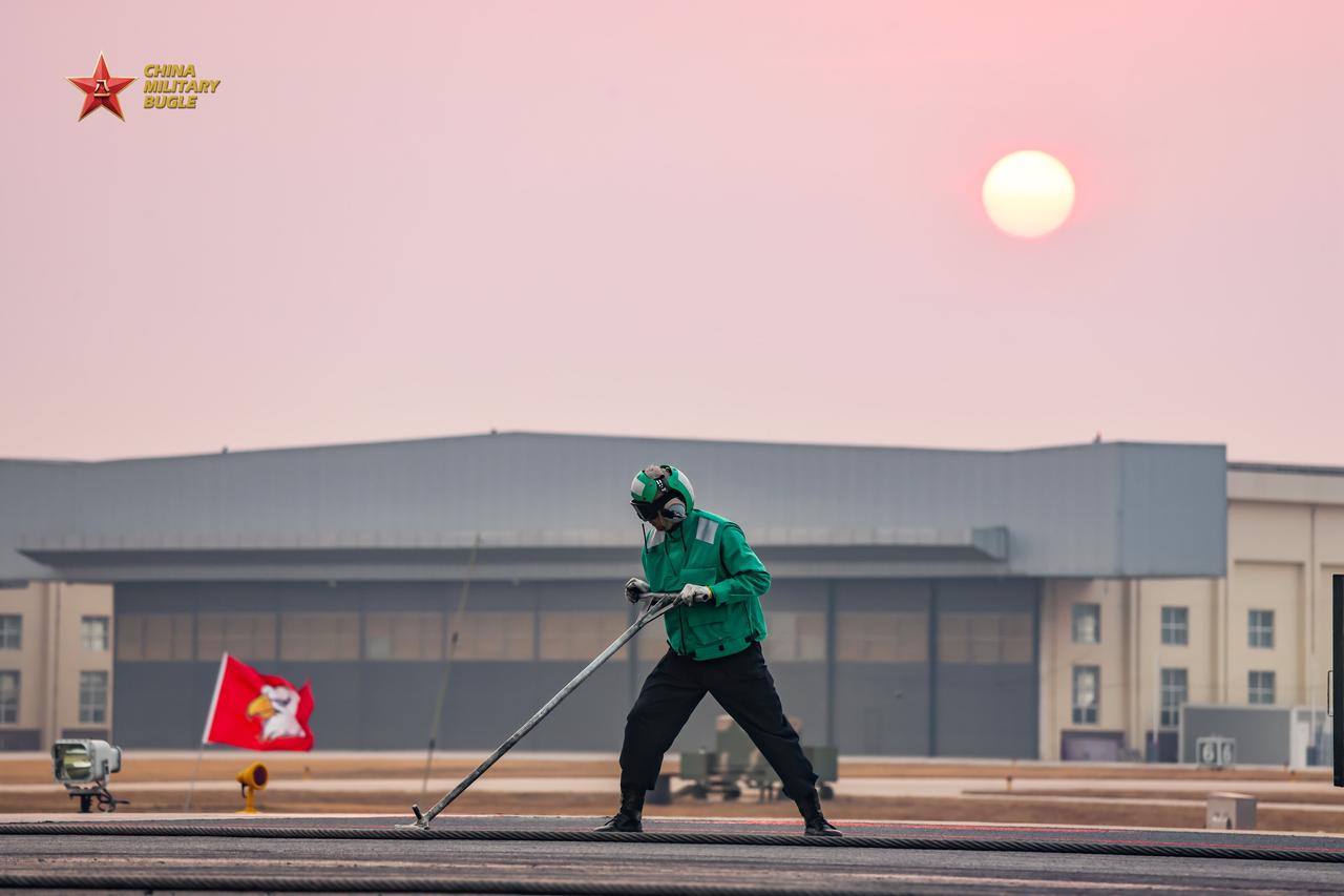 陆上航母“飞行甲板”的钩挂与释放。 隶属于PLA航空大学的阻拦装置操作人员正在对歼-15舰载战斗机进行阻拦着陆训练,并执行相应的回收循环动作。