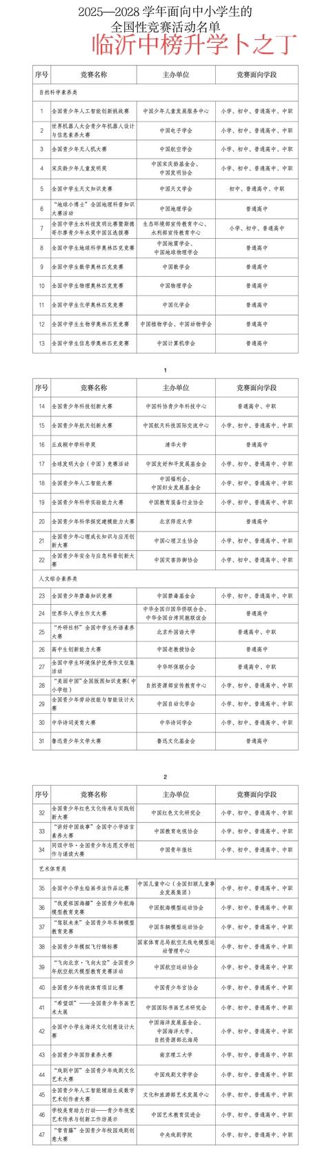 最近,有很多临沂高一家长问我,你们公司托管填写的云平台,是不是送白名单赛事证书?老卜科普一下,下图中的是2025——2028年的白名单赛事范围,请家长们仔细参考一下。如果机构答应你送白名单赛事证书,又很便宜,那基本都不靠谱,谨防上当受骗。欢迎大家留言文明交流!