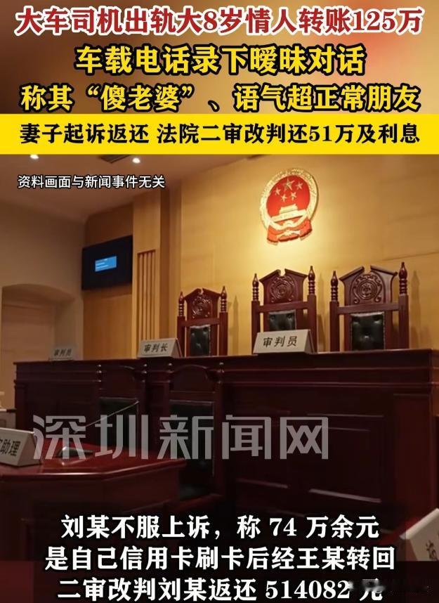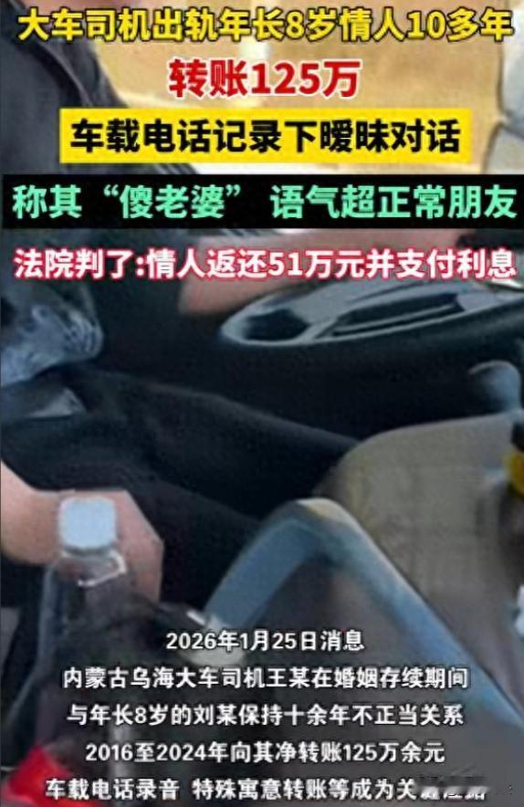 内蒙古,妻子在车载录音里,听到丈夫亲昵地喊另一女子老婆、傻老婆,在追问之下,丈夫承认和比自己大8岁的女子有了情人关系,还给情人转了100多万。妻子将丈夫的情人告上法庭,要求返还125万,法院最终这样判。 据深圳新闻网、文登发布的报道获悉,王某和阿娟结婚20多年,女儿都大了,王某是大车司机常年在外,阿娟在家操持。 2024年6月,阿娟偶然从车载录音里,听到丈夫王某和刘某的对话。王某对刘某亲昵地喊着老婆傻老婆,还在特殊节日转账,聊天内容也远超正常朋友。 阿娟听到这些,她拿着手机,反复听着那段录音,内心委屈极了。 等王某回到家,阿娟再也忍不住地质问他,王某一开始想蒙混过去,可在阿娟步步紧逼下,他还是承认了和刘某的情人关系。 原来,十多年前,王某偶然认识了比他大8岁的刘某,两人就走到了一起。这些年,王某背着阿娟,偷偷给刘某转了不少钱,总共125万。 阿娟为这个家辛苦付出,丈夫却在外面养情人,还把钱往外送,她对这段婚姻彻底失望了。 王某为了求阿娟原谅,交出转账证据,还保证和刘某断绝关系,阿娟看着王某悔恨的样子,她虽然怨恨王某,可想到多年夫妻情分和女儿,决定先通过法律要回属于自己的这些钱。 阿娟一纸诉状把刘某告上法庭,要求返还125万。 刘某却辩解,那些钱不全是王某赠送的,有一部分是王某还她信用卡欠款。还说和王某有感情,不该把钱都还回去。 王某和阿娟婚姻存续期间,所得财产是夫妻共同财产。王某未经阿娟同意,擅自把钱赠给刘某,损害阿娟财产权益。 民法典规定,违背公序良俗的民事法律行为无效。王某和刘某婚外情违背夫妻忠实义务和社会公序良俗,王某赠与行为无效。 一审法院审理认为,王某擅自赠与夫妻共同财产给刘某,违背公序良俗,赠与无效,刘某构成不当得利,应返还125万。 刘某不服判决,觉得自己冤枉,那些钱不都是白拿的,于是提起上诉。 二审法院对案件更细致核实,仔细审查每笔转账记录,调查王某和刘某经济往来。发现刘某说的部分钱是王某还信用卡欠款情况属实。 最终,二审法院认定王某实际赠送给刘某金额为51万余元。 法院认为,刘某基于不正当婚外情取得这51万余元,没合法依据,应返还给阿娟,还要支付利息。 有些人不珍惜家庭,搞婚外情,随意处置夫妻共同财产。这种行为既伤害家人感情,又违反法律。 阿娟为家庭付出多年,遭丈夫背叛,伤心愤怒正常。王某不负责任,伤害亲近的人。刘某明知王某有家庭,还保持不正当的关系,也是极不道德。 夫妻共同财产应共同管理使用,王某擅自赠与他人,违背道理和家庭责任。刘某接受钱,也没正当理由。 法律明确夫妻共同财产范围和处分原则,王某和刘某行为违反法律,要承担后果。 婚外情,违背夫妻忠实义务和公序良俗。 介入他人婚姻的人,会受道德谴责,还可能面临法律制裁。 基于婚外情取得的财产,最终要返还,可能竹篮打水一场空。 夫妻要珍惜感情,遵守忠诚原则。 阿娟一开始遭遇背叛,愤怒又无助,她没被情绪冲昏头脑,选择用法律维权,这很明智。 王某一开始隐瞒婚外情,还擅自赠与财产,错得离谱。好在最后醒悟,应该还有挽回家庭的可能。 刘某明知王某有家庭,还和他保持关系,接受财产,既不道德又违法。最后被判返还钱财和利息,也是自食恶果。 在法律面前,违背公序良俗的行为得不到支持,合法权益会得到保护。 婚姻不是儿戏,需要双方用心经营。忠诚是婚姻的基石,一旦动摇,家庭就可能破裂。 大家对这起案件有什么看法,欢迎一起讨论。