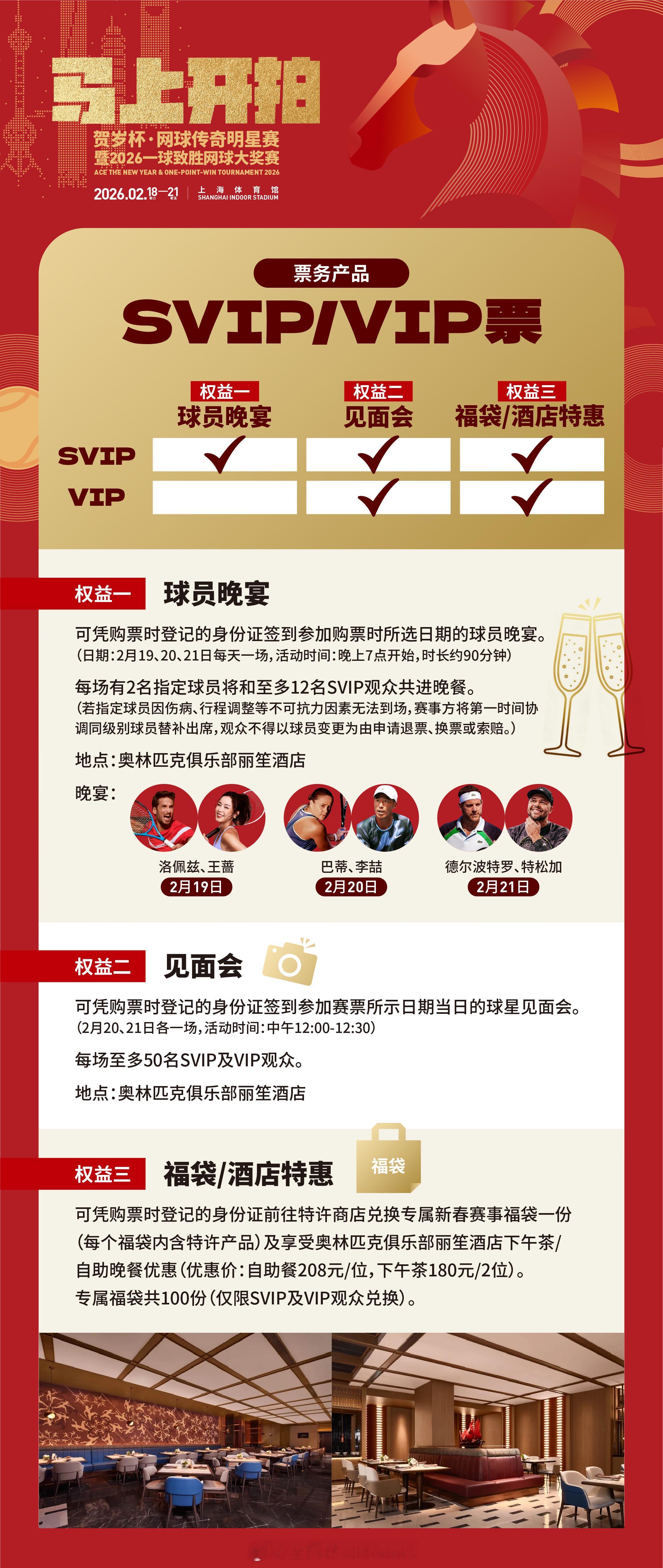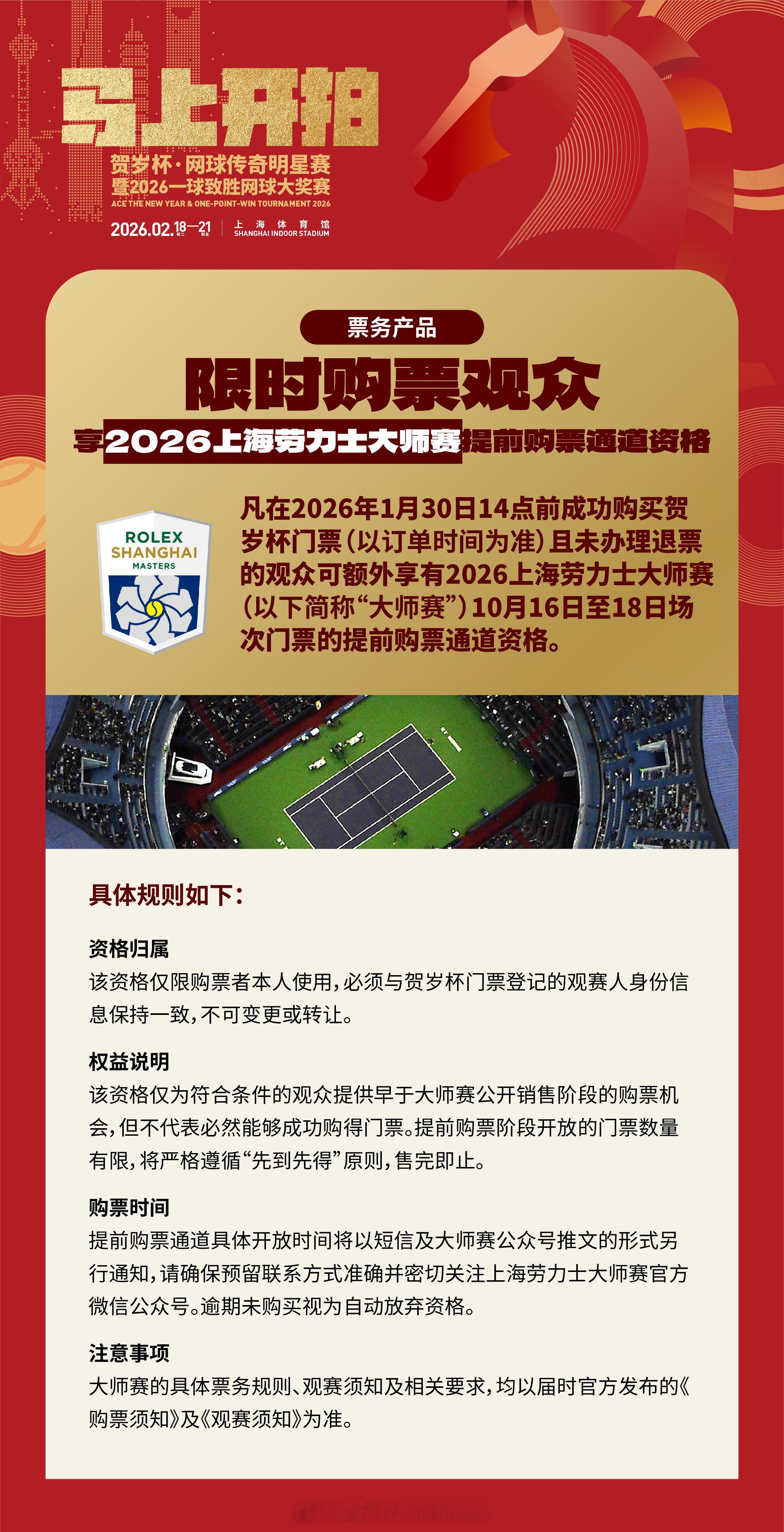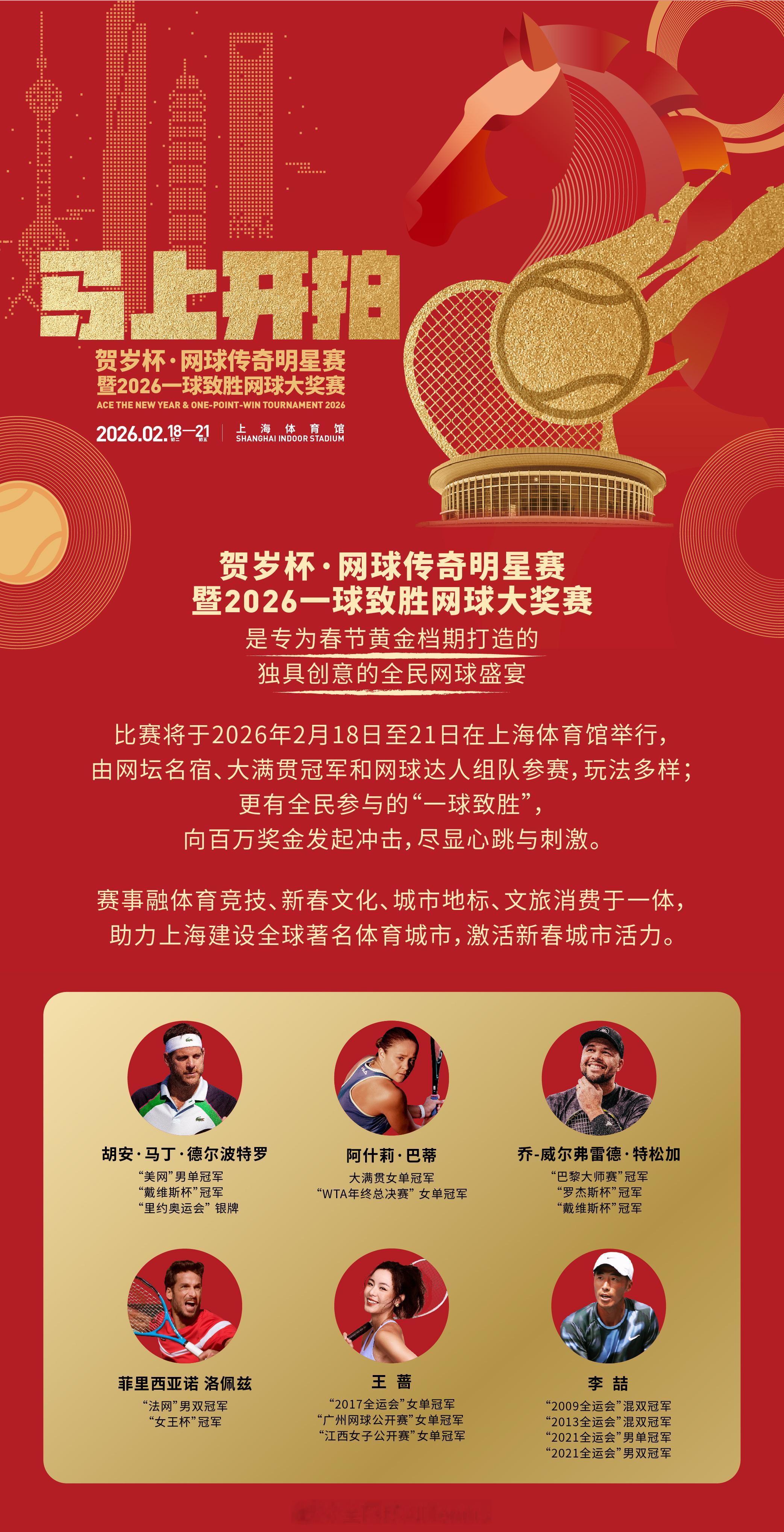 【贺岁杯•网球传奇明星赛暨2026一球致胜网球大奖赛已开票🔥】今年春节不简单,网球盛宴合家欢。2026年2月18日至21日、大年初二至初五,贺岁杯•网球传奇明星赛暨2026一球致胜网球大奖赛将在上海体育馆隆重举行。6名网坛传奇选手与8名人气网球达人联袂出战、512名业余网球好手摩拳擦掌,一场赛制独特新颖、阵容华丽强大、结合竞技体育与群众体育的新春网球嘉年华即将拉开序幕。1月28日中午12点,赛事票务销售正式启动。观众可通过下载官方票务渠道久事体育APP,或登录“久事体育APP”微信小程序及支付宝小程序在线选座购票。