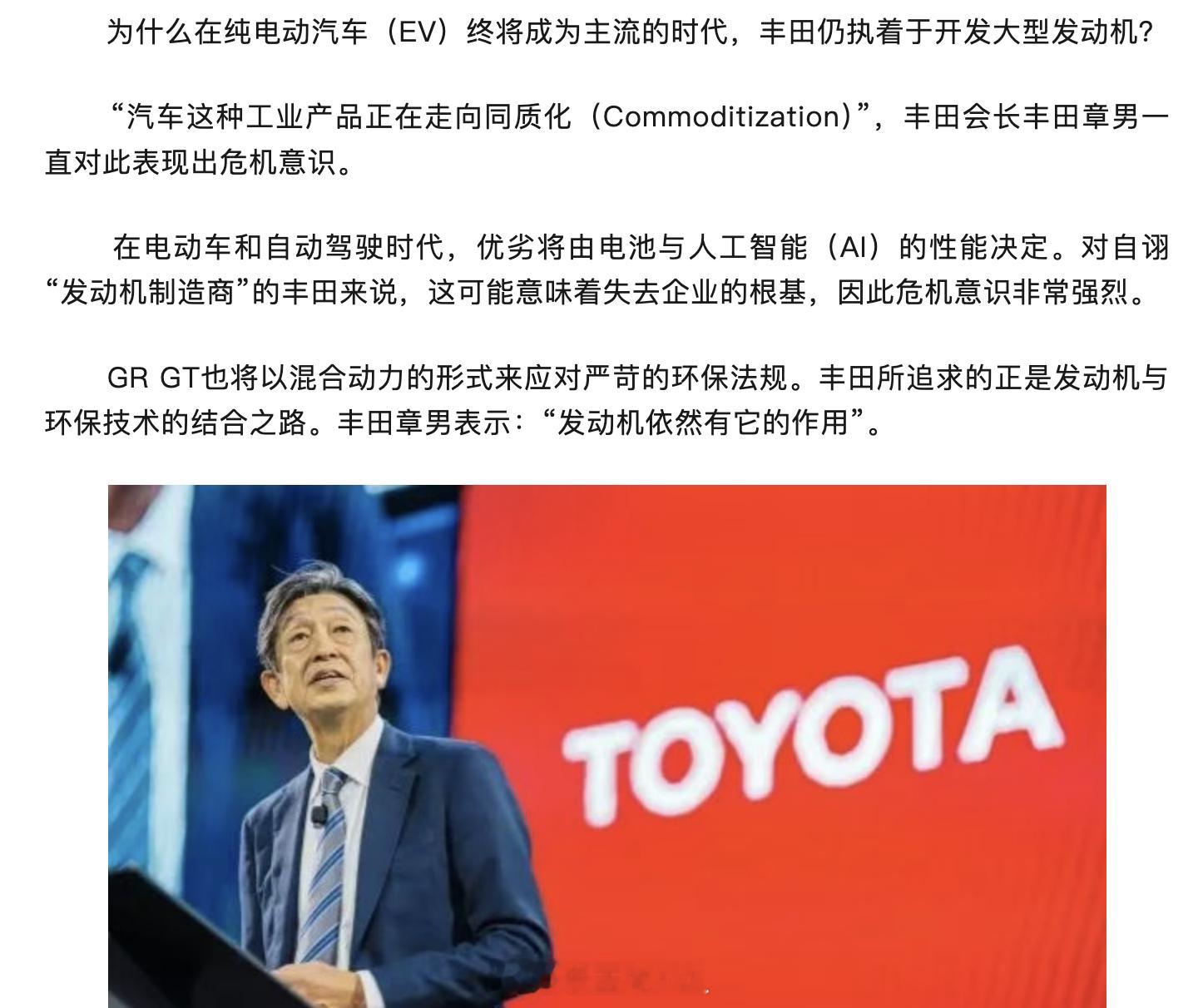 我们可以盘一下欧洲电动汽车市场258万,美国电动汽车市场125万,加起来400万不到,加上日韩其他区域,除中国之外的纯电动汽车市场大概在500万不到一些欧洲已经开发了2代纯电动汽车了,大众、宝马和奔驰在纯电平台上的投入,在欧洲是卖了不少车,但是利润率是不能看的,产业链规模还没起来。现在欧美日韩的车企,脑子正常的,都顺应趋势在延长燃油车和HEV的生命周期你回头来看,在中国燃油车可能还能保留20-30%的市场,这个市场的玩家确实是变少了。丰田接下来在中国,反正拿着中国的纯电技术和智能化来提供产品,在海外继续开发发动机也没毛病,中国会做的跟着中国做;在全球市场,这几年发动机也没停下来开发,这个比欧洲车企来回反复横跳的策略要好不少。当然客观来说,马自达、斯巴鲁等小的日本车企围着丰田转,也是一个很大的考虑因素,现在车企的利润薄,小规模的企业只能跟着大哥走如果将来中国比亚迪、吉利和奇瑞,各自往600-700万的规模发展,是会压缩全球车企的生存空间,你怎么选道路就很重要了大v聊车新能源汽车