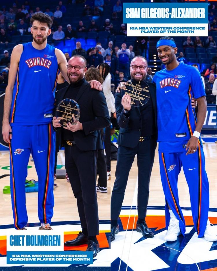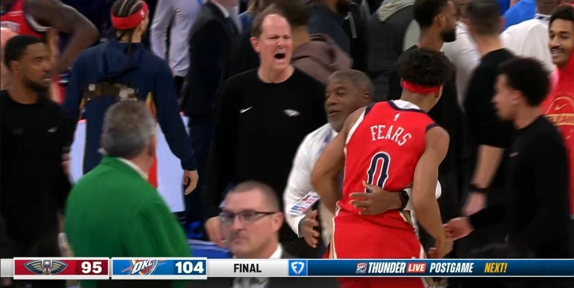NBA最新战报:西部第一雷霆迎战西部倒数第一鹈鹕!比赛打的激情澎湃火星四溅!雷霆104:95艰难战胜鹈鹕避免尴尬三连败。鹈鹕上场赢了西部第二马刺这场又好悬没赢第一雷霆!NBA无弱旅呀! 雷霆头牌亚历山大砍下29分6个篮板4个助攻连续得分20➕来到118场,距离历史记录张伯伦的126场还差8场。 另外一个获胜功臣是中锋霍姆格伦!砍下20分14个篮板3个助攻5个盖帽!打爆了胖虎锡安!锡安砍下21分钟11个篮板。 赛前亚历山大领取了12月联盟最佳球员奖杯!霍姆格伦领取了12月最佳防守球员奖杯! 值得一提的是:胜负已定的情况下两队球员最后一攻,费尔斯上篮和多特有纠缠,多特推搡之后两人开启冲突,互相揪衣领,引发双方球员大冲突。等联盟的罚单吧!