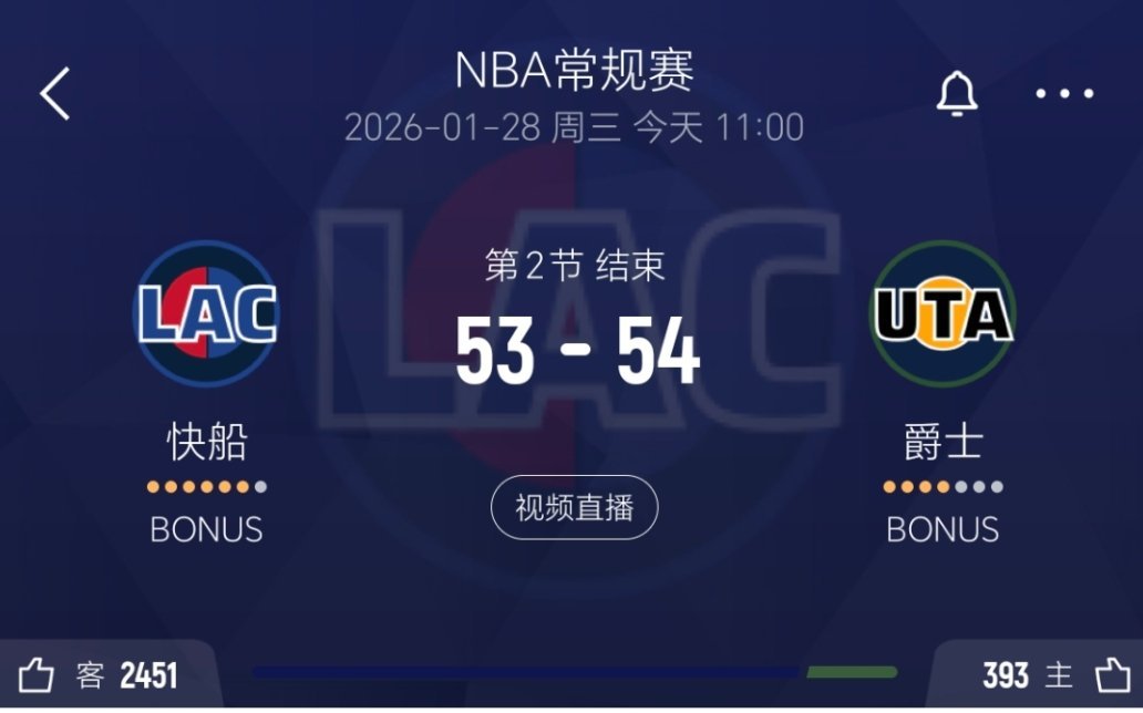上半场结束,快船落后1分!感觉如何?快船vs爵士