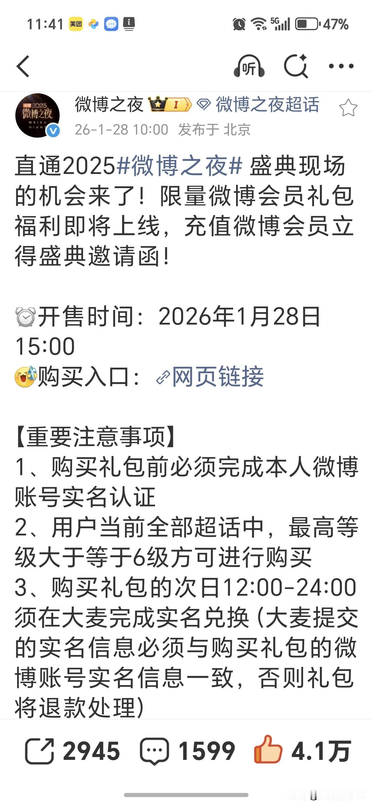 微博之夜门票今天下午3:00开售,有需要的关注时间,直接去微博链接进入,超话等级大于6级才可购买哦