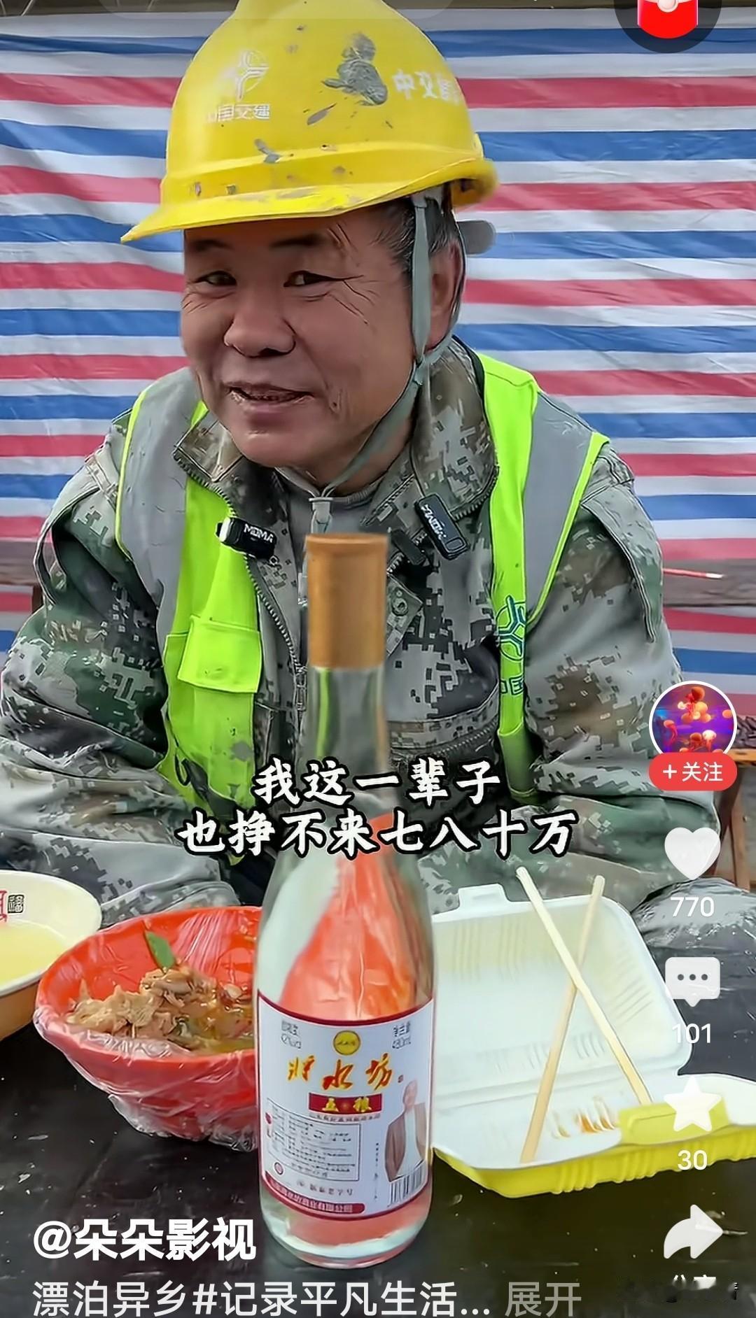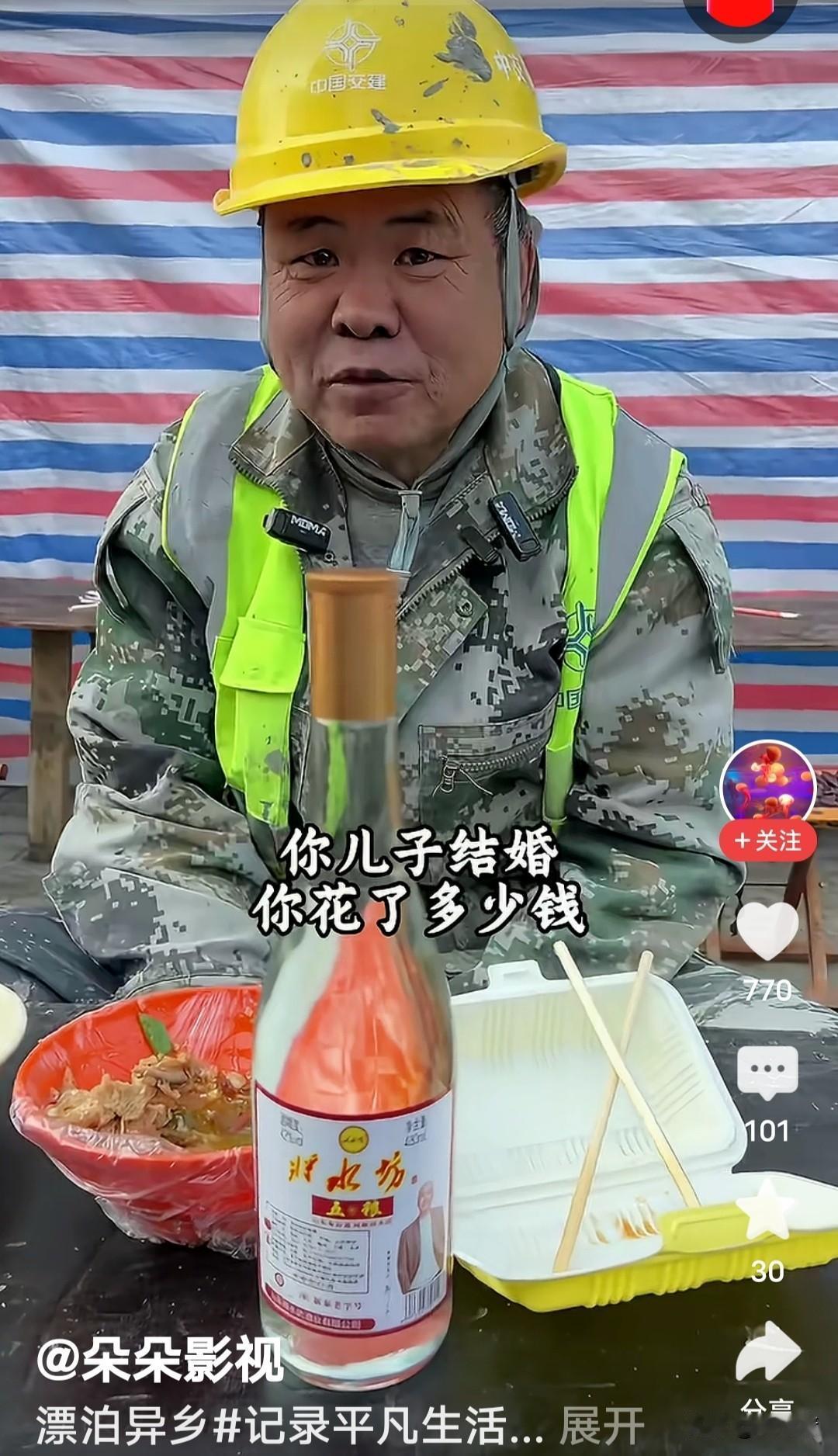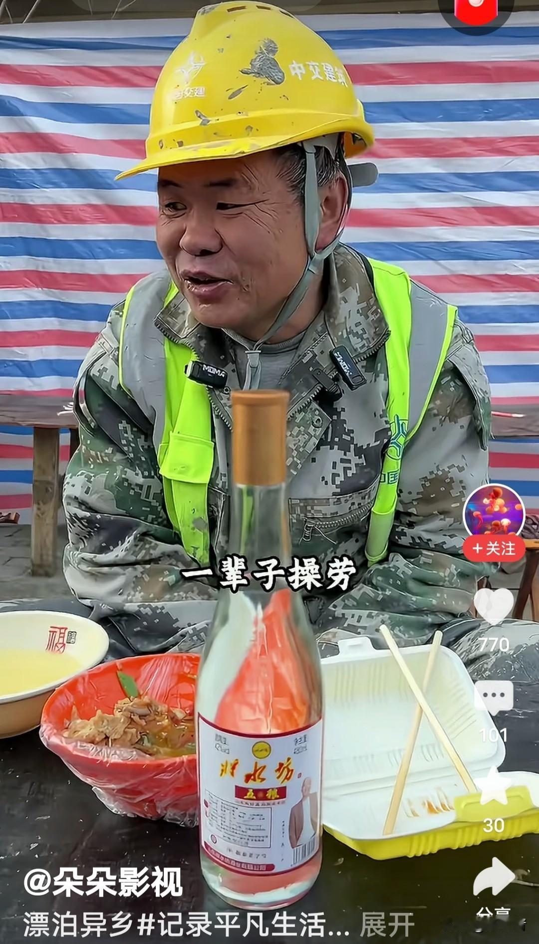 街拍农民工,“人来到世上就是受罪的。”啥时候享福啊?“一把土一埋就享福了。”多心酸的一句话,他经历了什么? 在山东,这位农民工来自内蒙古赤峰。他吃着简单的饭菜,喝点小酒,说出了久违的心里话。 他在回复主播时说,“自己就一个儿子,给儿子买房,在儿子身上花了七八十万。现在身上还欠着几十万呢,我这一辈子也挣不来七八十万。”其中滋味只有自己懂。 主播问他,“最疼你的人是谁?”他微笑着说,“自己。”意思是谁也靠不住。主播,“父母呢?”“都不在了。” 主播,“你认为幸福吗?”他说,“不是幸福就是遭罪。一辈子辛苦操劳,干不完的活,又挣不到钱,只有下班回到家里才轻松点。享福,一把土一埋就享福了。” 出力不挣钱,挣钱人不出力。中年人养家糊口责任大,子女教育、医疗,买房、买车,结婚生子,哪样都离不开钱,生活压力山大,幸福成了他们一生的追求。你说他们幸福吗? 中国建筑农民工 这就是我农民工 农民工生存实录 行走的农民工