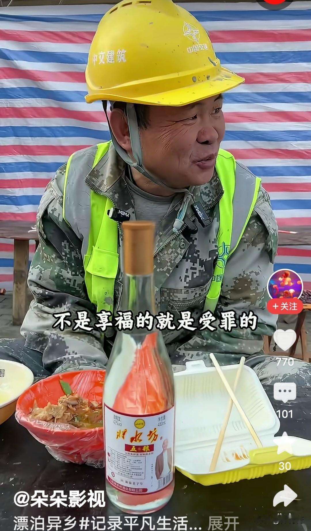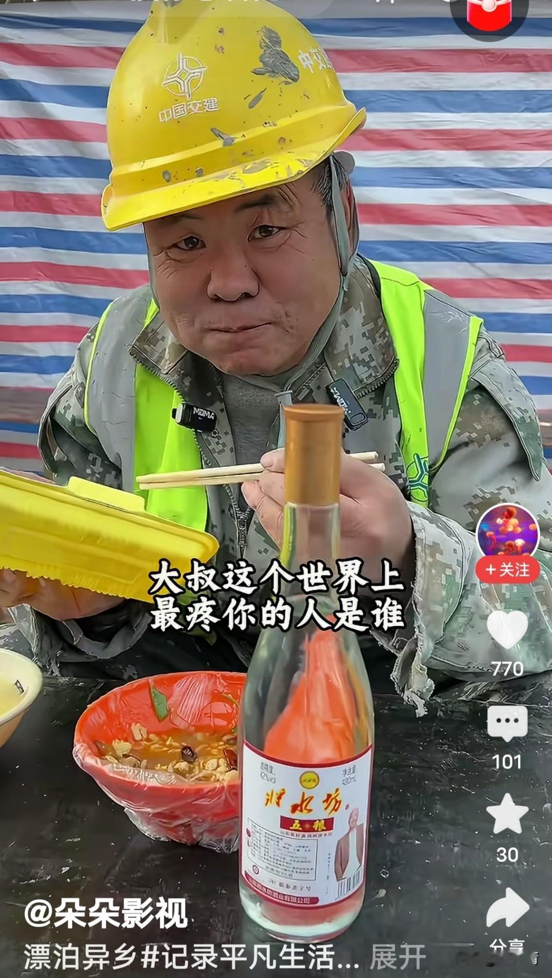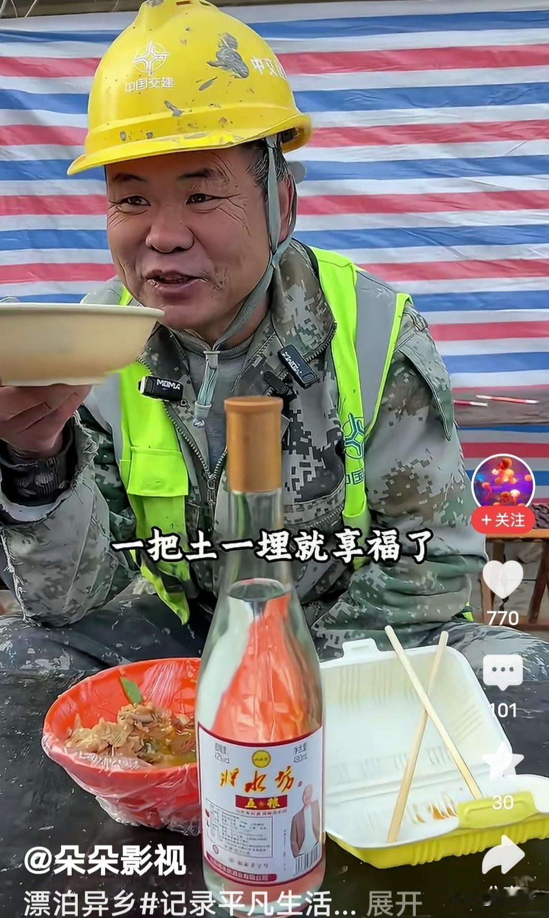 街拍农民工,“人来到世上就是受罪的。”啥时候享福啊?“一把土一埋就享福了。”多心酸的一句话,他经历了什么? 在山东,这位农民工来自内蒙古赤峰。他吃着简单的饭菜,喝点小酒,说出了久违的心里话。 他在回复主播时说,“自己就一个儿子,给儿子买房,在儿子身上花了七八十万。现在身上还欠着几十万呢,我这一辈子也挣不来七八十万。”其中滋味只有自己懂。 主播问他,“最疼你的人是谁?”他微笑着说,“自己。”意思是谁也靠不住。主播,“父母呢?”“都不在了。” 主播,“你认为幸福吗?”他说,“不是幸福就是遭罪。一辈子辛苦操劳,干不完的活,又挣不到钱,只有下班回到家里才轻松点。享福,一把土一埋就享福了。” 出力不挣钱,挣钱人不出力。中年人养家糊口责任大,子女教育、医疗,买房、买车,结婚生子,哪样都离不开钱,生活压力山大,幸福成了他们一生的追求。你说他们幸福吗? 中国建筑农民工 这就是我农民工 农民工生存实录 行走的农民工