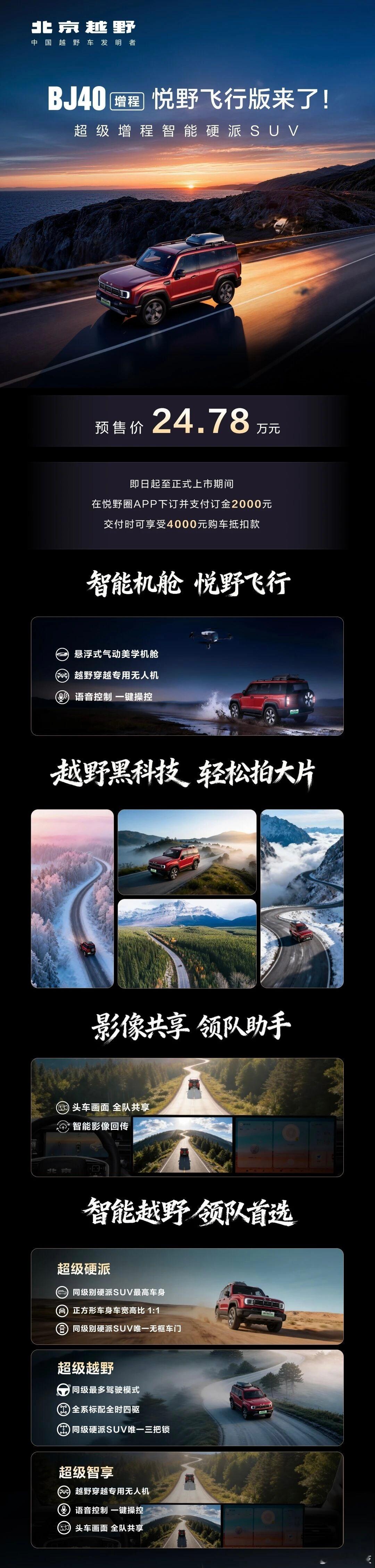 北京越野BJ40家族新春三车齐发!BJ40增程赤兔标准版/BJ40燃油巨幕版上市、BJ40增程悦野飞行版预售。BJ40版本真够多的,已经十个了吧!北京越野机海战术玩的可以!BJ40