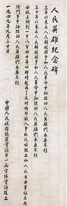 1955年,人民英雄纪念碑开工以后,林徽因认为碑文应该用楷体来写,但具体由谁来写犯了难,时任北京市市长的彭真说:“周总理的字苍劲雄伟,刚劲有力,有如颜碑,风格端庄凝重,可以问问周总理”。 这座纪念碑的缘起,最早可追溯到1949年北平和平解放后,雕塑家滑田友率先提议,在天安门广场建一座兼具民族性的纪念建筑,缅怀为家国牺牲的先烈,这一提议迅速得到响应,当年9月的政协会议上,兴建人民英雄纪念碑被正式确定,而选址就历经了一番热烈讨论。 有人提议东单的热闹地段,有人主张安放在八宝山公墓,最终是周恩来总理一锤定音,选定了承载无数近代历史记忆的天安门广场,这里既是皇城旧址,更已成为人民的广场。 1949年9月30日,开国大典前一天,毛主席带着政协代表在广场举行奠基典礼,亲手铲下第一锹土,彼时广场条件简陋,是叶剑英紧急动员人力整理出场地,这份仓促里藏着对先烈最迫切的敬意。 此后九年,从设计方案征集到石材运输,每一步都充满挑战,光是碑身所需的百吨花岗岩,就从山东青岛浮山寻得,当地百姓主动拆房让路,工人用滚木一点点运送,朱德总司令还亲自到车站迎接这块英雄石。 设计环节梁思成与林徽因夫妇主张采用中国传统碑式风格,庄重朴素的方案最终被采纳,而到了题字环节,新的难题出现了,正面八个大字,大家一致认为应由毛主席题写,他的书法气势磅礴,恰好契合纪念碑的恢宏气场,毛主席也十分上心,一口气写了多幅供专家挑选,尽显对先烈的敬畏。 背面碑文的书写却起了争议,碑文由毛主席起草共155个字,分三段回溯百年历史,连续三次点题人民英雄永垂不朽,字字千钧,梁思成提议仍由毛主席书写,保持风格统一。 但林徽因提出了不同见解,背面碑文字数多碑面窄,毛主席的字体奔放开阔,容易显得拥挤,用工整的楷书更显端庄紧凑,徐悲鸿等学者也补充,毛主席日理万机,如此繁琐的书写任务不应再劳烦他。 就在众人僵持时,时任北京市市长的彭真抛出了一个合适人选周恩来总理,他评价周总理的字苍劲如颜碑,端庄凝重,既有书法功底,又常为烈士题词,身份与气质都极为契合,毛主席听闻后当即点头,这份默契源于对彼此的了解与信任。 周总理最初谦逊推辞,觉得自己的字不足以承载这份厚重,但在众人恳请下,他最终接下任务,哪怕在北戴河养病期间,也坚持每日练习,他先逐字打磨笔法,再通篇连贯书写,圆笔藏锋、线条凝练,把儒雅与刚强融于一笔一画中。 前后历经四十一次书写,周总理才选出最满意的一幅,亲手送到工地时还不忘叮嘱:不满意我再重写,雕刻家刘开渠见后赞叹不已,称这幅作品字字传神,无需修改。 1958年纪念碑竣工,两位伟人的笔墨在碑上相映成辉,构成一座独一无二的双绝碑,碑文里没有提及任何个人,只聚焦人民英雄,彰显着共产党人的人民观。 如今驻足碑前,不仅能看见书法之美,更能读懂这份跨越岁月的用心,从普通人的汗水到领导人的坚守,这座碑承载的从来不是个人荣耀,而是一个民族对先烈的永恒铭记。 麻烦看官老爷们右上角点击一下“关注”,既方便您进行讨论和分享,又能给您带来不一样的参与感,感谢您的支持!
