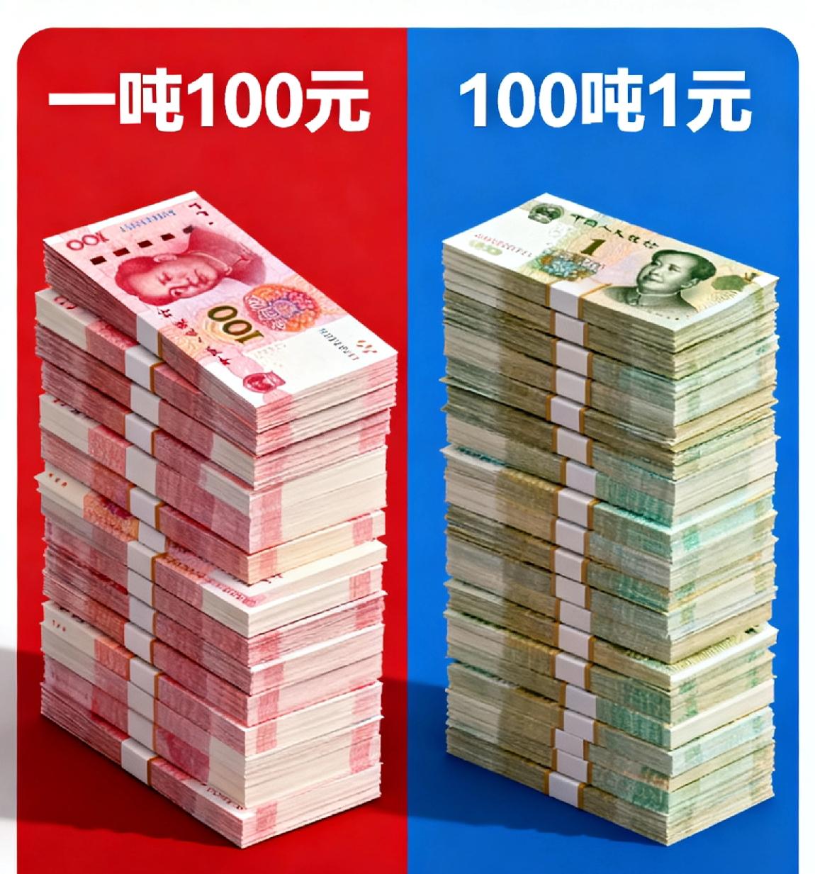 一吨100元和100吨1元哪个更值钱? 如果有人让你选,你会选择一吨100元还是100吨一元? - 1张100元纸币约1.15克,1吨(1000000克)约有869565张,总金额≈8695.65万元; - 1张1元纸币约0.77克,100吨(100000000克)约有129870129张,总金额≈1.2987亿元。 结论:100吨1元纸币的总金额更高,更值钱。 钱,让你明白了什么道理1元钱的购买力 百元人民币