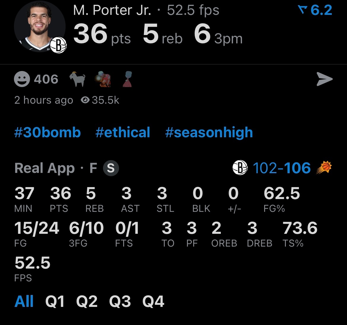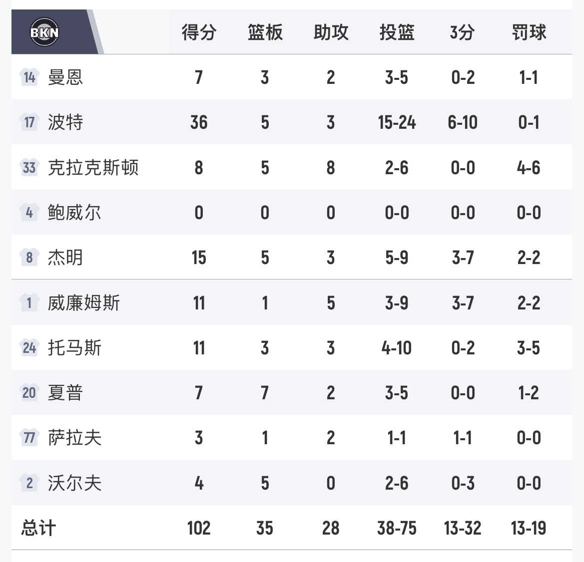 篮网102-106客场惜败太阳,波特36分5板3助攻3抢断,六个三分球。马威27分6板0失误,16投13中。 篮网vs太阳