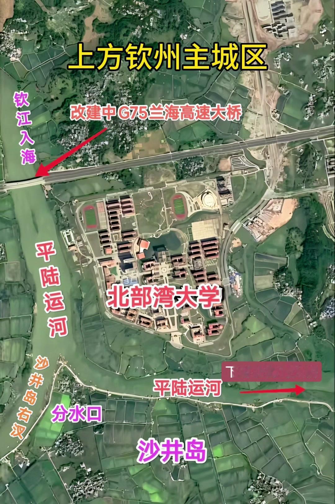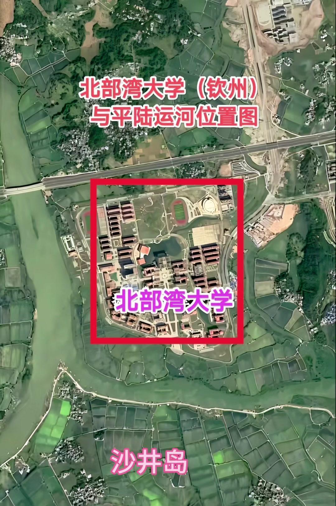 平陆运河北部湾大学位于钦州主城区下方,沙井岛北端(犁头嘴)对岸。大学西端与东南临