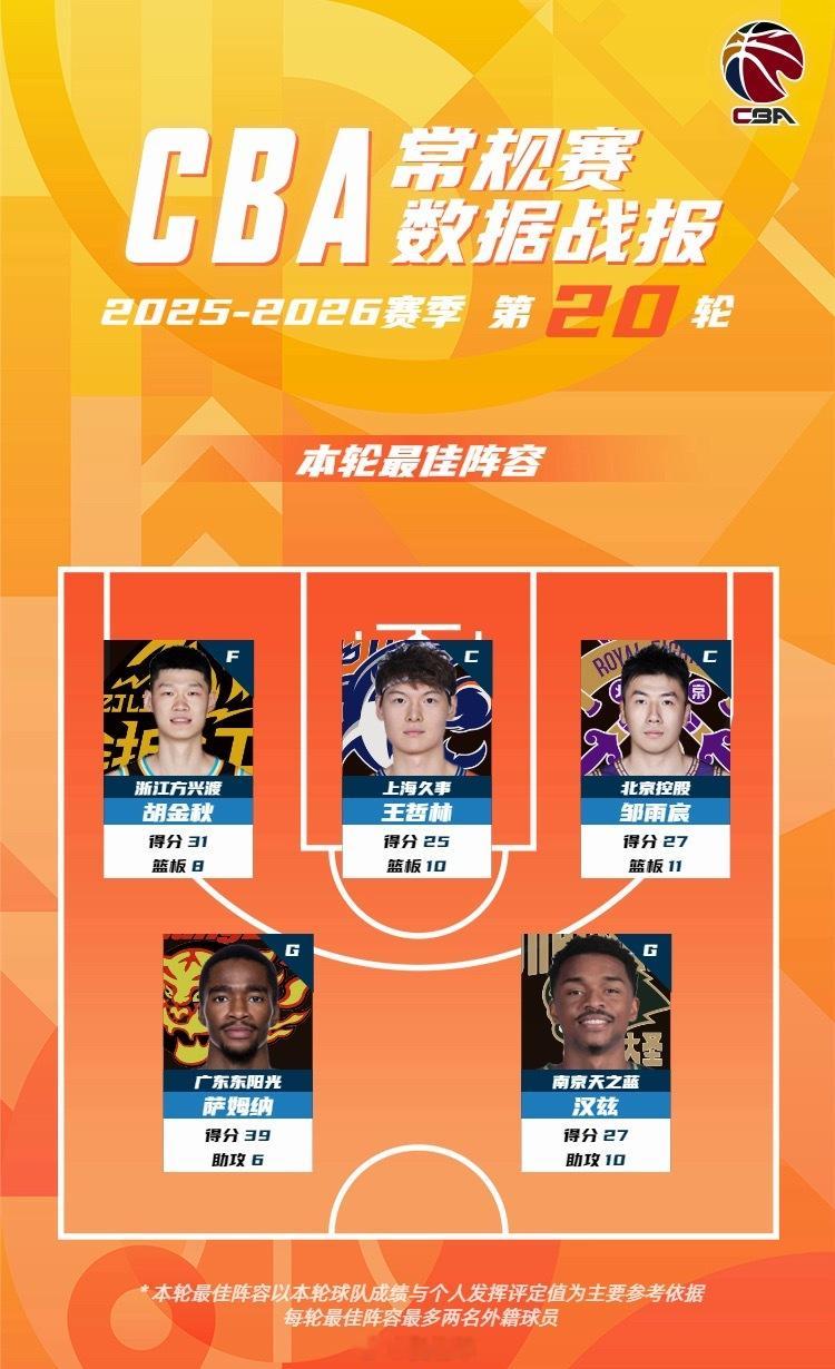 CBA公司公布2025-26赛季常规赛第20轮最佳阵容,广东男篮外援萨姆纳入选。广东宏远