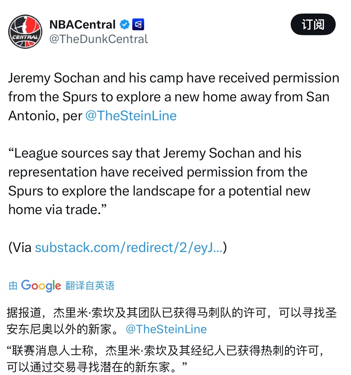 记者Marc Stein 报道:“索汉及其经纪团队已获得马刺许可,可以为其寻找新东家并促成交易。”索汉本赛季为马刺出战27场,场均14.1分钟拿到4.3分2.7篮板的数据。三项命中率为48.5%、25.7%和68.8%超话创作官 |篮球年末狂欢季 |NBA交易
