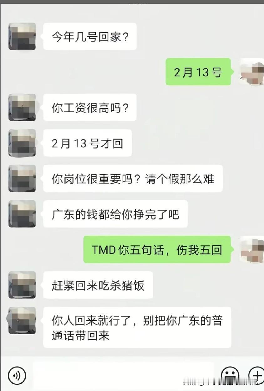 你五句话,伤我五回! 过年回家的痛谁懂? 朋友一句“今年几号回家?”,本以为是关心,结果后面连珠炮似的暴击: “你工资很高吗?” “2月13号才回?” “你岗位很重要吗?请个假那么难” “广东的钱都给你挣完了吧” 最后还要补刀“别把你广东的普通话带回来”。 打工人的委屈瞬间就绷不住了:我们在大城市挤地铁、熬大夜,拼了命想多赚点钱回家,在他们眼里却成了“钱赚不够”“架子大”。 最扎心的是那句“你五句话,伤我五回”,这不就是每个在外漂泊的人过年回家的真实写照吗? 你们过年回家,有没有被亲戚朋友这样“戳心窝子”过?