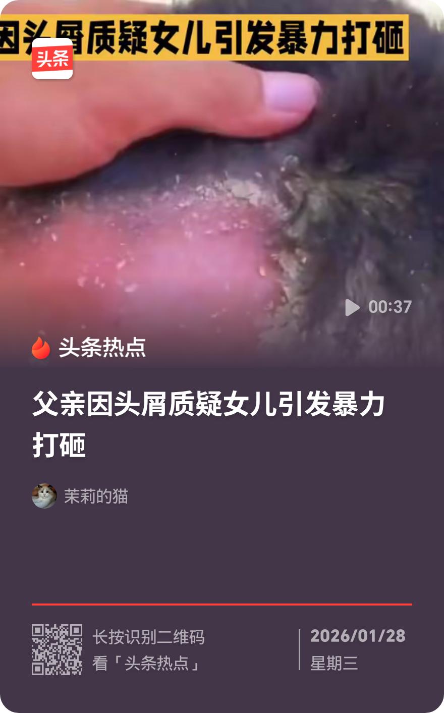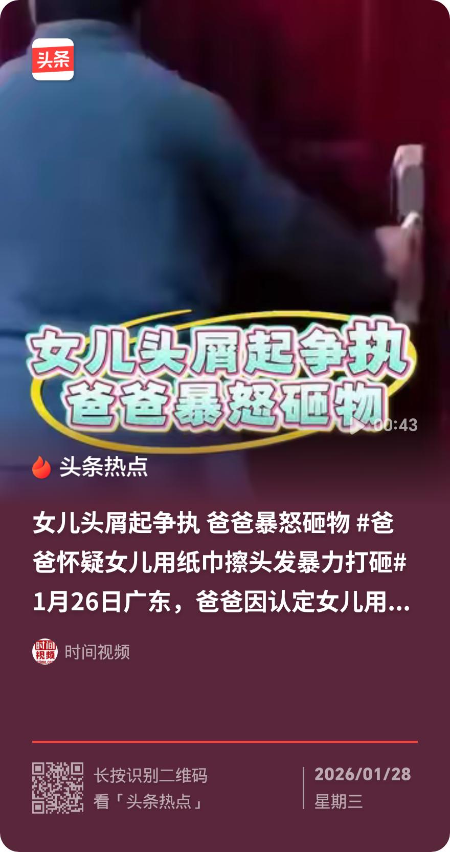 为契合快讯“直击重点、简短有力”的核心要求,我将提炼事件关键信息,以冲突性开头吸引关注,用口语化表达还原真相,同时融入家庭沟通的正向引导,确保信息完整且兼具价值。 广东一父亲因女儿头上有头皮屑,竟对亲闺女拳打脚踢,连劝阻的妻子都被牵连,这事儿近期引发全网愤怒! 据孩子母亲爆料,事发当天,女儿洗完头用吹风机打理时,被父亲发现发间有头皮屑。父亲一口咬定女儿是用纸擦的头发,不听“用毛巾擦拭”的解释,当场抄起吹风机砸向女儿的椅子。 受惊的女儿赶紧躲进卧室反锁房门,可父亲依旧不依不饶,追到门口用脚猛踹、拿椅子狂砸,誓要破门而入。孩子母亲上前阻拦,却被丈夫扇耳光、用大箱子砸击,根本拦不住暴怒的他。 最终房门被砸开,父亲揪出躲在角落的女儿,再次动手扇耳光。原本只是一件微不足道的小事,却升级为家庭暴力,让网友们既震惊又气愤。 目前该男子的正脸已被网友扒出,大家纷纷谴责其行为:“就算真用纸擦了,也不该对孩子下这么狠的手!” 家庭暴力不仅会给孩子留下终身心理阴影,还涉嫌违法。 家庭相处本应靠沟通而非拳头,父母的情绪管理对孩子成长至关重要。遇事多倾听、少冲动,才能守护好家庭的温暖,这也是每个成年人该有的责任与担当。 这篇快讯聚焦核心事件、语言精炼,既保留关键信息又符合传播需求。若你觉得需要补充法律知识点、调整语气强度,或增减某部分细节,可随时告知我优化。能送给我一句处在低谷期激励的话吗