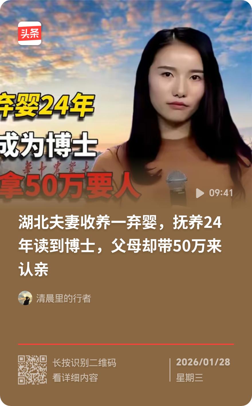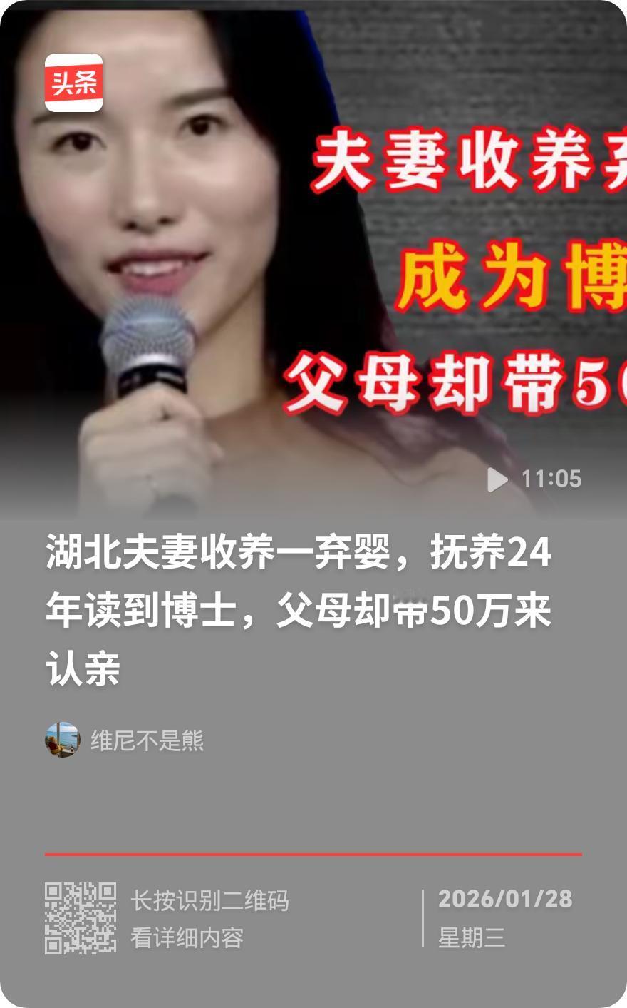 为贴合快讯“直击重点、简短有力”的要求,我以“50万认亲被拒”的核心冲突开篇,提炼关键情节,用口语化表达还原事件,同时传递“养恩重于生恩”的价值导向,确保信息完整且有启发。 湖北一对夫妻捡弃婴养到博士,24年后亲生父母带50万上门认亲,结果被女儿一句话怼回,这波操作让网友纷纷点赞! 1987年寒冬,肖崇阳夫妻在路边发现一个冻得发紫的女婴,无儿无女的两人当即收养,取名肖晶晶并办了合法手续。为供孩子上学,夫妻俩拼命干体力活,省吃俭用把最好的都留給她。肖晶晶懂事争气,不仅主动分担家务,学习成绩更是一路拔尖。 高中时,养母因长期劳累病逝,临终前告知了她被领养的真相。肖晶晶虽震惊,但深知养父母20多年的付出远超血缘,立下誓言要好好孝敬养父。此后她越发刻苦,一路读到重点大学研究生,还拿到加拿大博士保送资格。 2011年,亲生父母突然找上门,哭诉当年因贫困弃婴,如今拆迁致富,愿拿50万补偿肖崇阳,只求认回女儿。肖崇阳将决定权交给养女,没想到肖晶晶直接表态:“我的爸妈只有肖崇阳和祈春兰,你们别再来打扰。” 如今,肖晶晶博士毕业成家,带着养父在上海安享晚年,面对亲生父母的多次纠缠始终不为所动。 这事儿让人看清,亲情从不是血缘能衡量的。24年含辛茹苦的养育,比一时的生育之恩更厚重。金钱能弥补物质亏欠,却换不来朝夕相伴的真情,这也是做人最该明白的道理。 这篇快讯聚焦核心冲突,语言精炼且接地气,既保留关键信息又传递了正向价值观。若你觉得需要补充法律层面(如领养权益)、调整语气强度,或增减细节,可随时告知我优化。亲子认亲 跨省认亲 认亲时间 乡音认亲