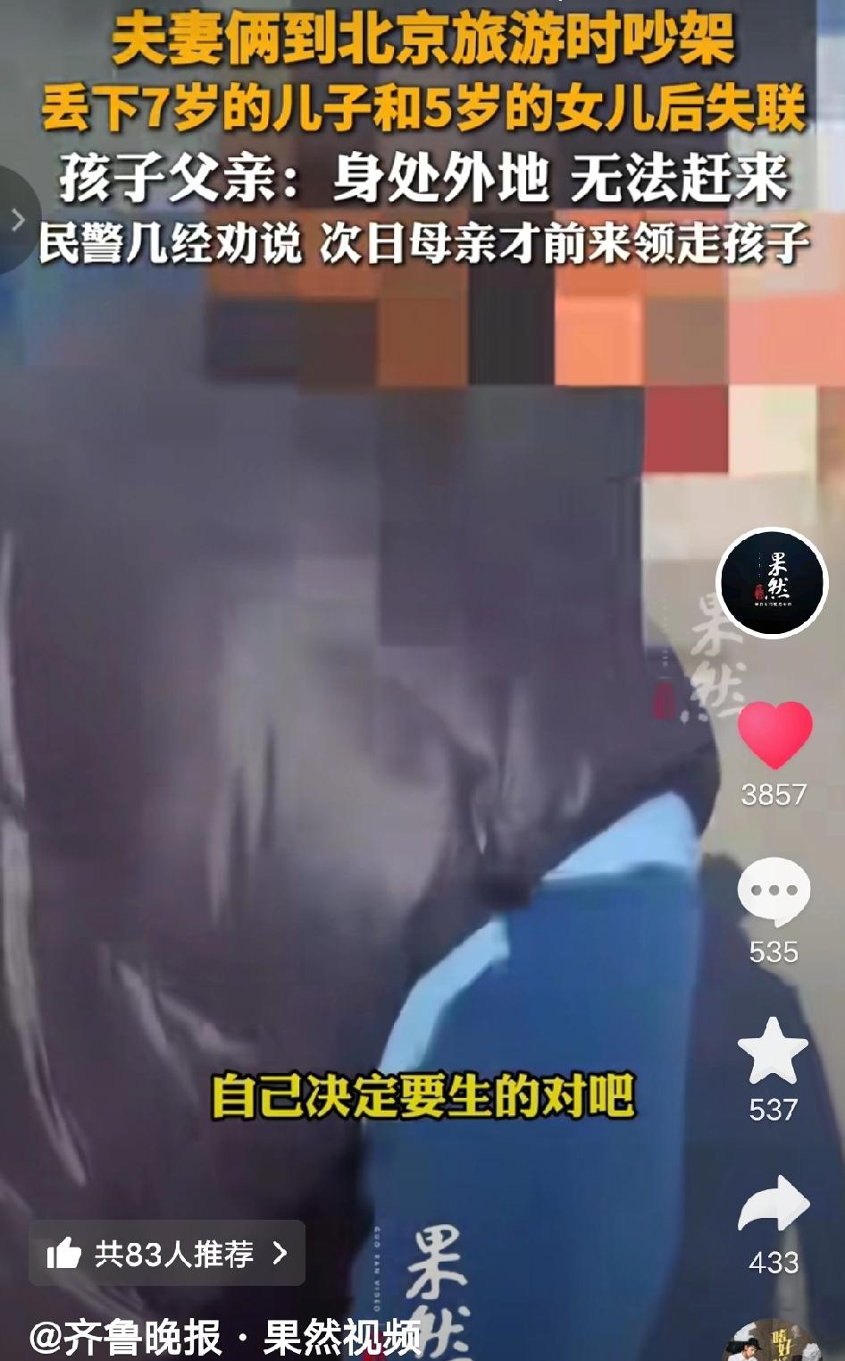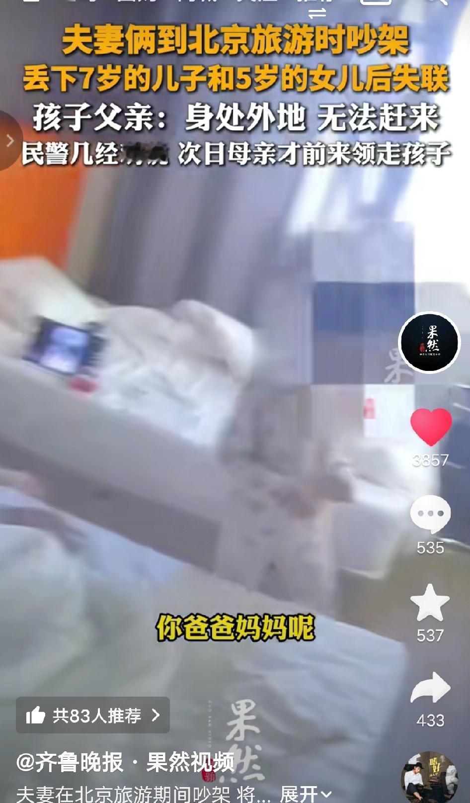 离谱!北京,一对夫妻旅游时吵架,竟把7岁儿子和5岁女儿独自丢在酒店玩失踪,最后民警苦劝一夜,母亲才终于露面来接孩子! 2026年1月23日,北京朝阳区一家酒店里,7岁的哥哥和5岁的妹妹正缩在床角哭。他们的爸妈刚才还在为“要不要去故宫”吵得不可开交,一转眼就双双消失,只留下两个孩子在陌生的城市里孤立无援。 同行的朋友实在看不下去,报了警。等民警赶到时,酒店房间已经过了退房时间,报警人也已经离开,两个孩子连饭都没吃,抱着彼此瑟瑟发抖。 民警把孩子带回派出所,一边给他们点了热粥和炸鸡,一边联系孩子父母。结果父亲在电话里轻飘飘一句“我在外地,赶不过来”,就挂断了电话;母亲更是直接关机,彻底失联。 民警轮流当起了“临时爸妈”,陪孩子玩拼图、讲故事,直到深夜才哄睡。同时,他们一遍遍给孩子母亲发消息、打电话,告诉她:“你现在的行为已经涉嫌遗弃未成年人,再不来接孩子,我们将依法处理。” 经过一夜的劝说,孩子母亲终于在第二天早上赶到派出所。看到孩子脸上还挂着泪痕,她红着眼眶道歉,最终把孩子接走了。警方也对夫妻二人进行了严厉的批评教育,明确告知他们遗弃未成年人可能面临的法律责任。 此事引发网友热议 有网友说“太离谱了!这哪是吵架,分明是拿孩子撒气泄愤!7岁5岁的娃,在陌生的北京酒店里被独自丢下,黑灯瞎火的,万一有人闯进来,万一孩子跑出去迷路,后果根本不敢想,这爸妈当得也太不合格太自私了!” 也有网友说“最气人的是那个爸爸!一句‘在外地’就想撇清所有责任?孩子是两个人生的,凭啥吵架后只让妈妈收尾?遇事就逃避,一点担当都没有,这种男人真的不配当爹!” 还有网友说“还好遇到了负责任的民警!又给孩子买吃的又陪孩子玩,熬夜照料还耐心劝说,真的太暖心了!要是没民警帮忙,俩娃指不定要受多少罪,希望警方能好好教育这 对夫妻,别让他们再犯这种糊涂错!” 对于这个事情你怎么看呢? 夫妻吵架丢孩子 北京旅游遗弃事件 争议民生 未成年人监护 警方暖心救助 来源:齐鲁晚报-果然视频