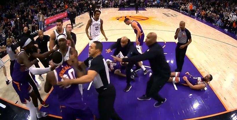 恶汉狄龙又使用花活!裁判吹哨比赛暂停狄龙不松手造成大规模冲突五人吃T!NBA成大型角斗场。 太阳106:102险胜篮网最后一分钟出现精彩绝伦的一幕。狄龙搞事被杰明推飞!引发大型冲突!五个人技术犯规。太阳得利笑到最后。 这小子全场出战34分8秒,15投9中(三分5中2)、罚球6中6,砍下26分3篮板3助攻1抢断1盖帽填满数据栏,正负值+4。获胜最大功臣呀!狄龙·布鲁克斯 狄龙冲突 狄龙争议犯规 格林狄龙恩怨 狄龙·垫脚 狄龙战术争议