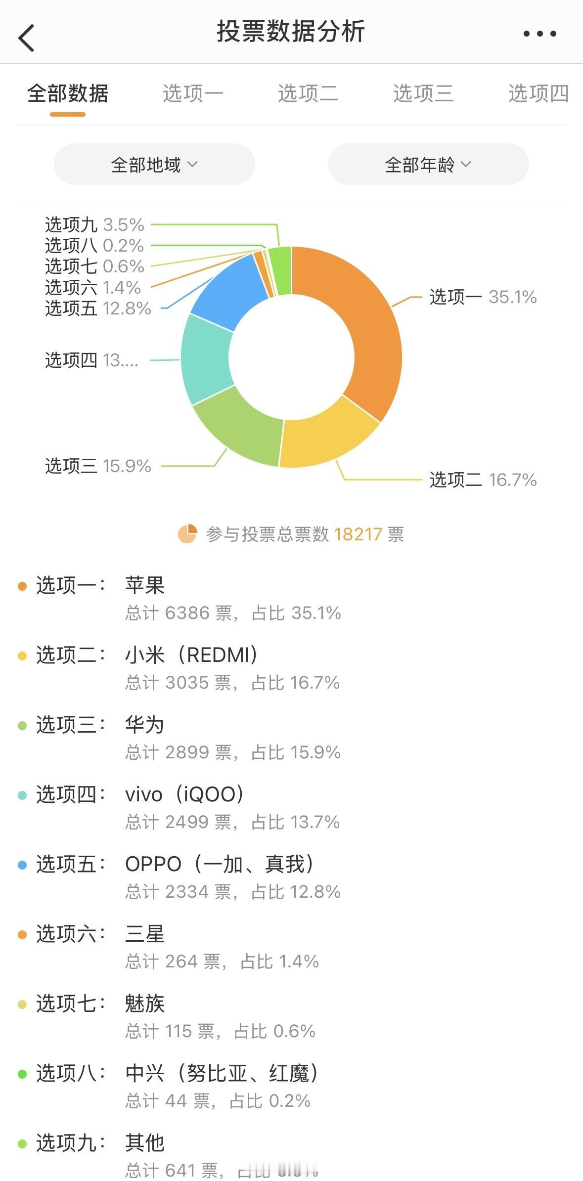 【正在用的手机是哪个品牌?最多选3个】1.5万人参与,总共18217票。 没想到用苹果手机的人数占比高达35.1%,6386张票[泪奔]