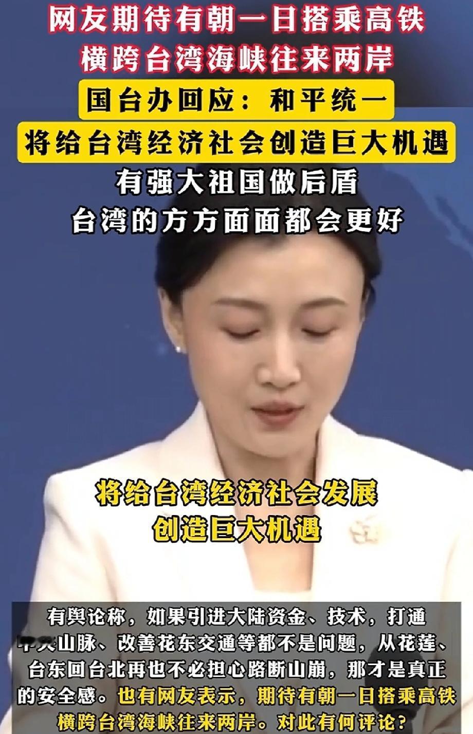 国台办说和平统一将给台湾创造机遇,这可太对了。从经济上看,统一后台湾能深度融入大陆庞大的市场,像农产品、特色商品等销路肯定更广。福建平潭的对台合作就是个例子,很多台商来这投资创业,赚得盆满钵满。 在民生方面,和平统一能让台湾民众享受更多便利,教育、医疗等资源交流也会更频繁。而且不用再担心战争风险,生活稳稳当当的。 在国际舞台上,以中国整体的力量,台湾能有更多机会参与国际事务。和平统一对台湾来说,绝对是百利而无一害的好事。