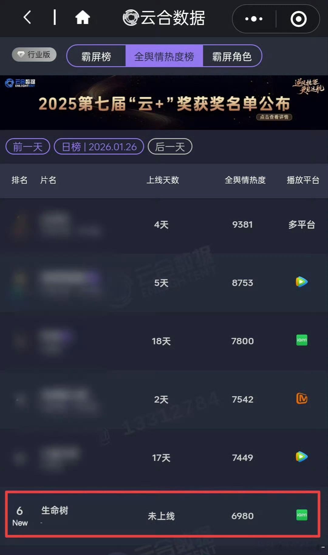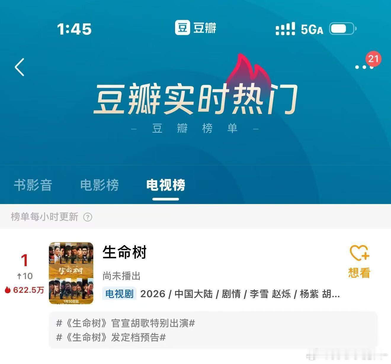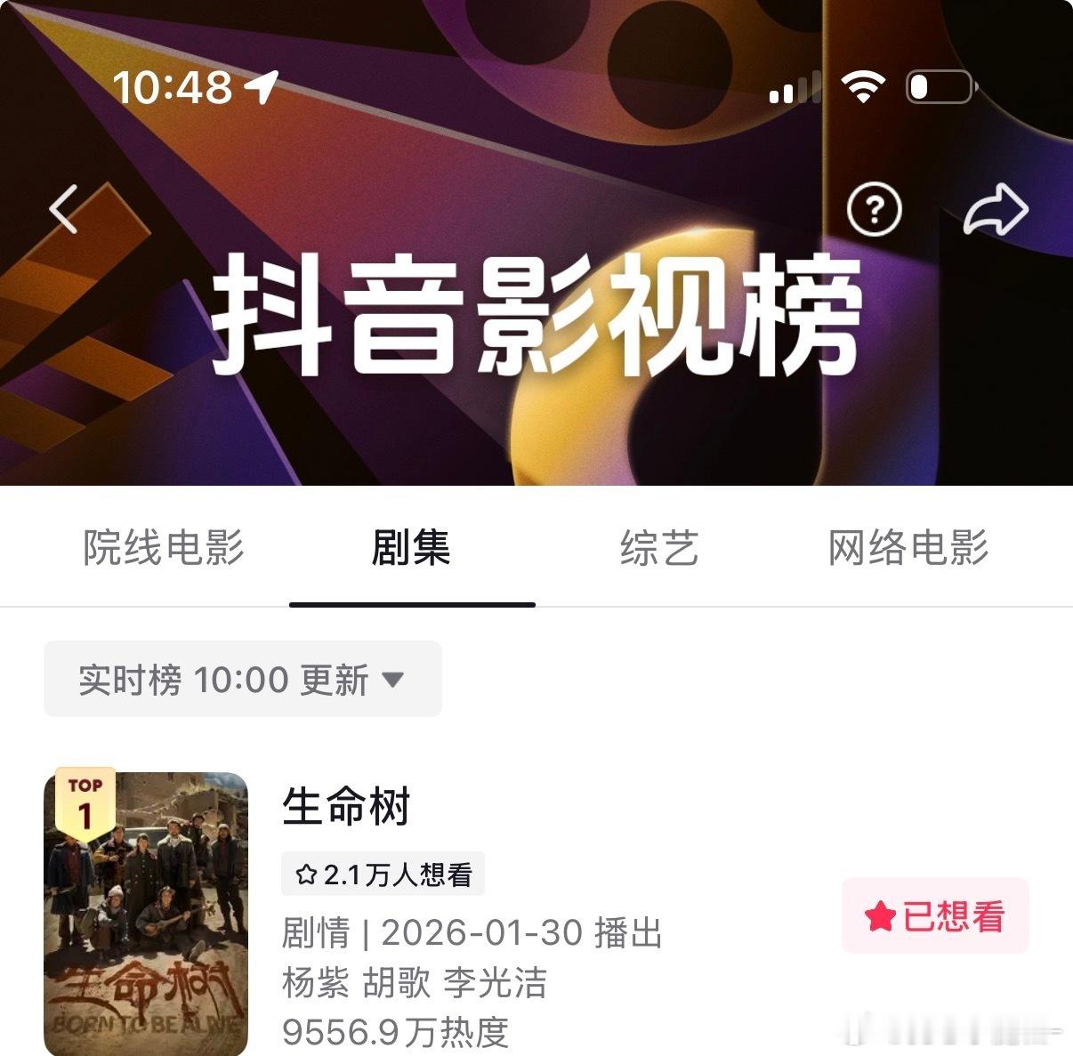 生命树 各平台数据都很好哦,抖影视榜登顶 抖指122.2w,爱奇艺站内双榜第一,豆瓣热门双榜第一,生命树开门红,谁又破防下嘿水了?那就1.30来看咯