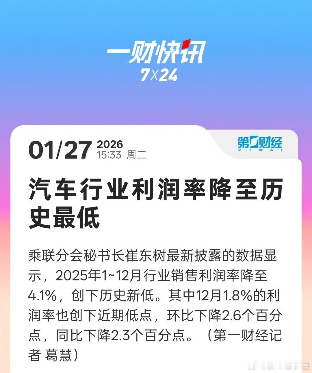 汽车行业利润率降至历史最低大V聊车 卖的越多,赚得却越少从实际情况来看,合资和自主品牌车企是真的很努力在“卷”!看样子,26年真会有一些品牌被迫下桌