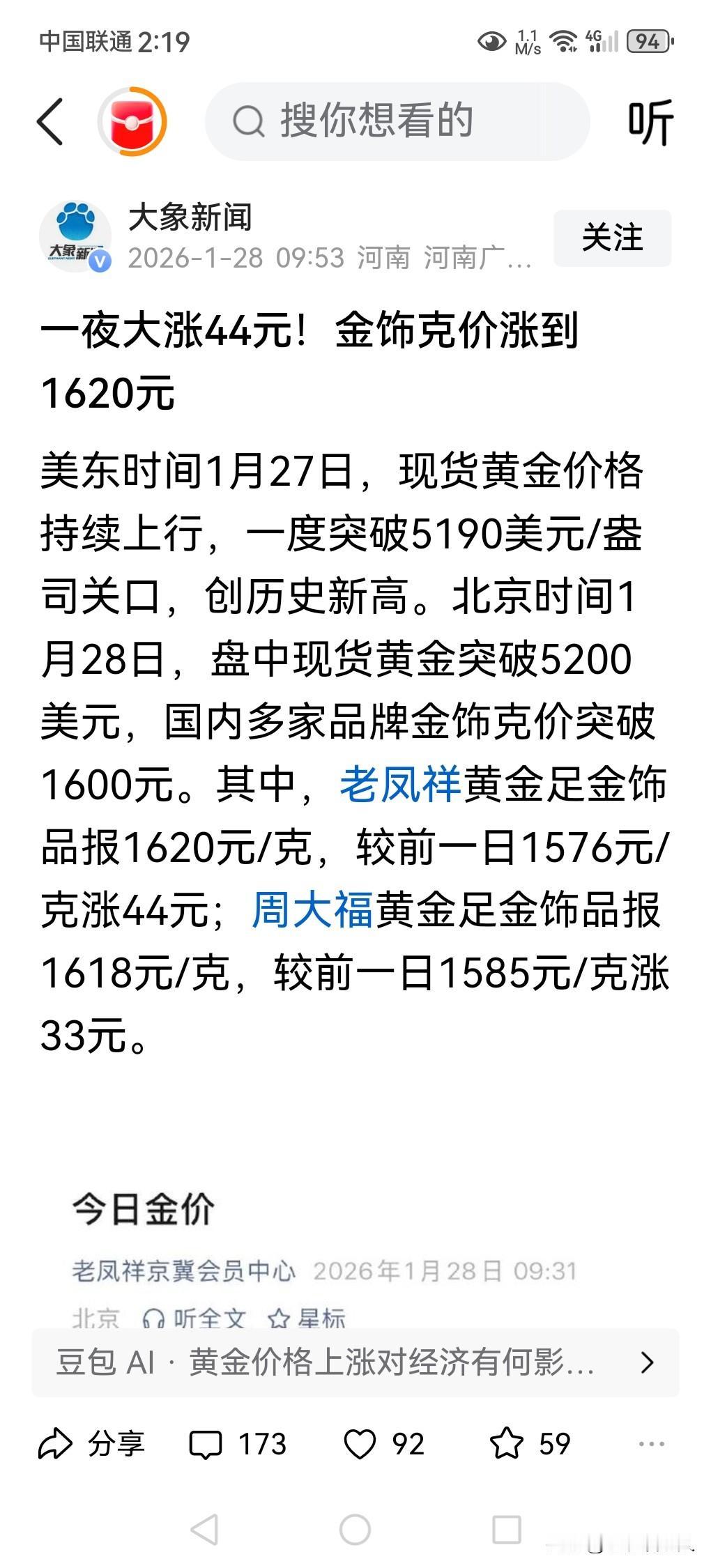 金首饰价格突破1620元/克! 据媒体1月28日报道,今日黄金挂牌价格已经突破1