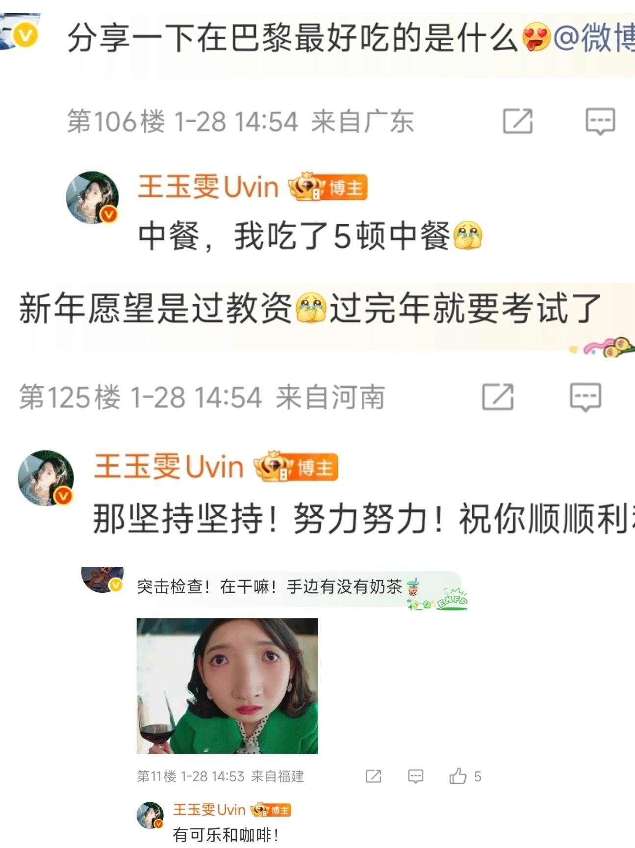 王玉雯 我的电子闺蜜王玉雯完全就是我的电子闺蜜!像极了我那刚从巴黎玩疯了回来的闺蜜在跟我碎碎念!刚落地就马不停蹄报备行程:拍了100多张照片要精挑细选,说剧播的时候焦虑到天天刷弹幕看剧评,连年后要去录节目、接下来要挑剧本的事都一股脑儿说给我们听。粉丝的评论也是认真回复,完全就是我和闺蜜聊天的样子,没有一个距离感!