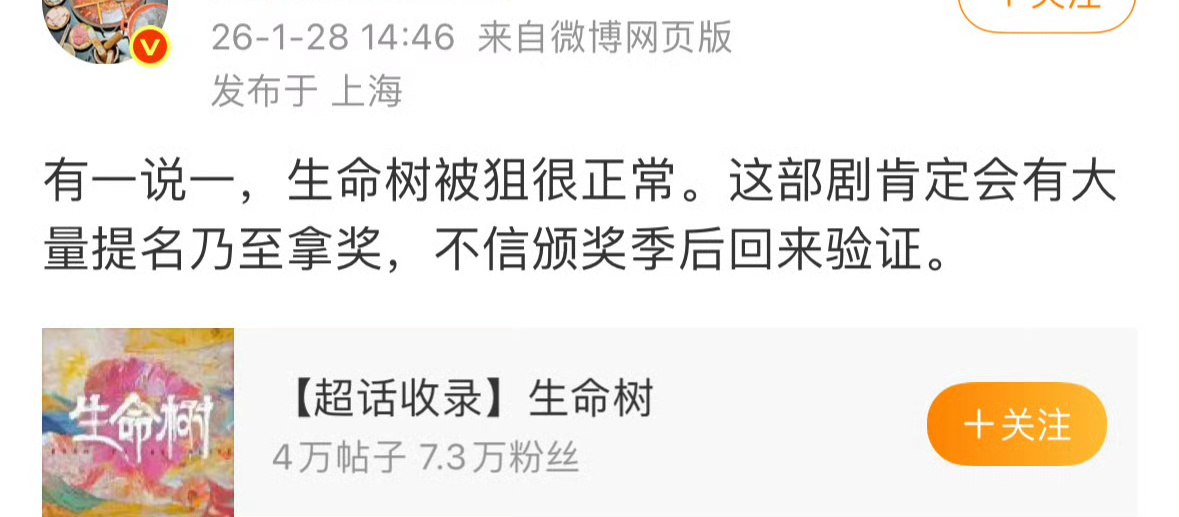 看现在的架势,生命树的嘿和红都来势汹汹。生命树这个剧的题材就很符合🌬️比,如果真的大爆拿奖,那杨紫在内娱的地位你们可以尽情想象了。