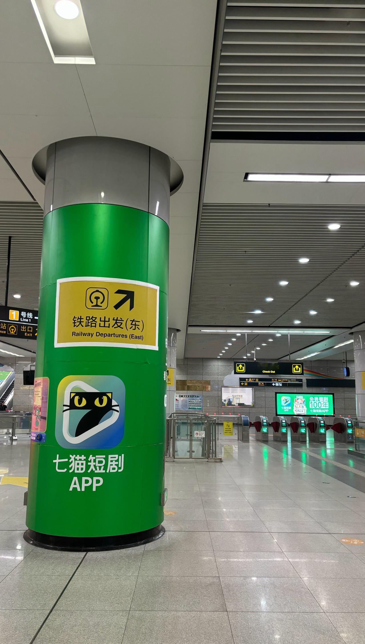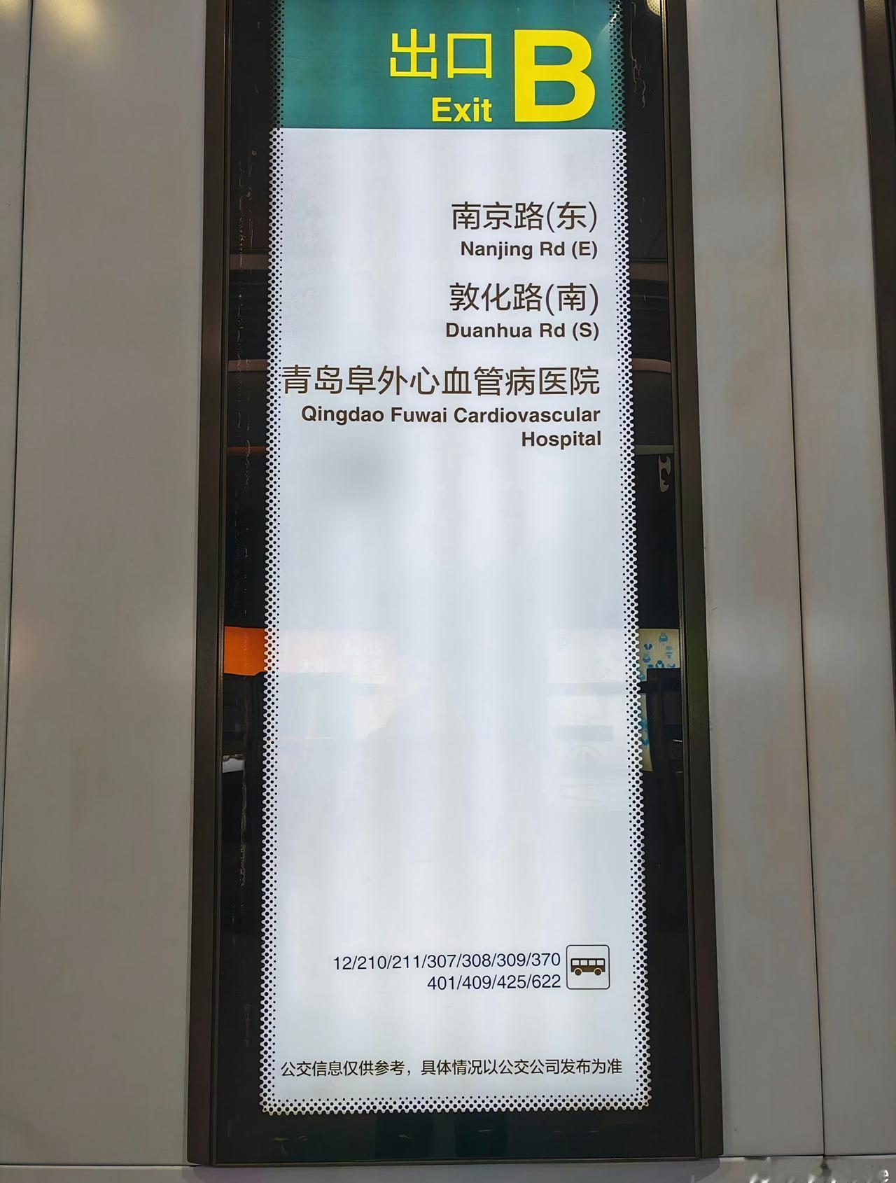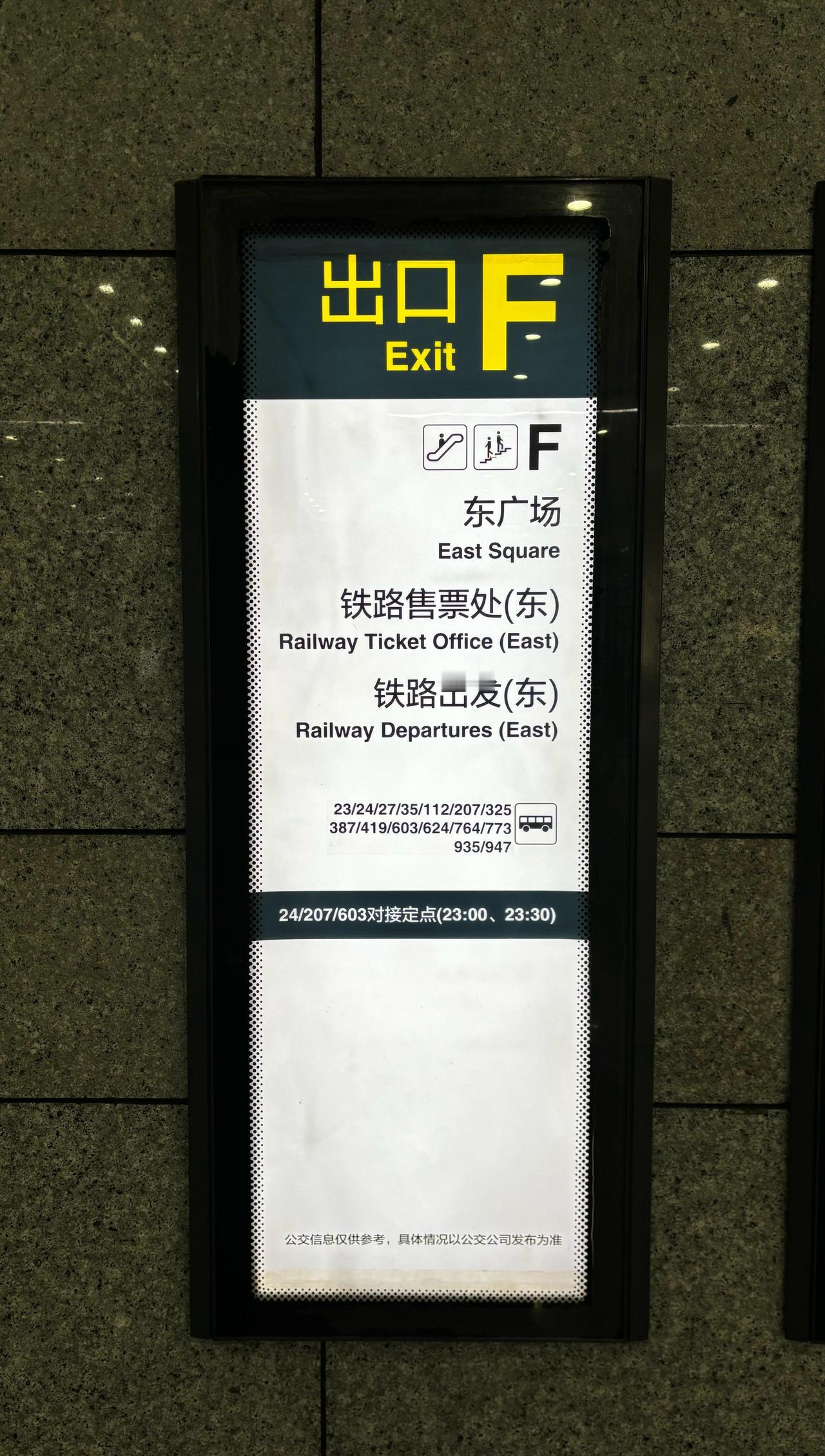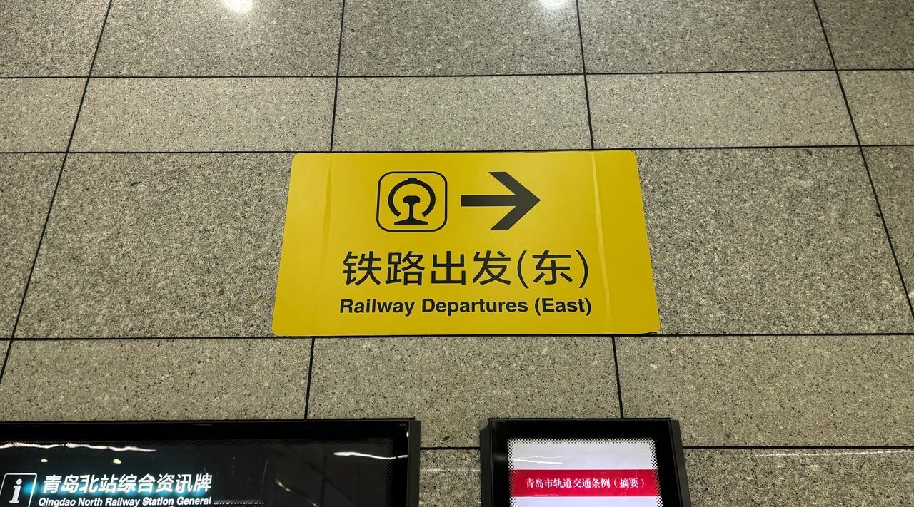 【青岛地铁啄木鸟】𝟓𝟎𝟕𝟕.铁路出发(东) 🚇1/3/8号线 青岛北站 A/F出口白底黑字竖版灯箱(图1/图2)、黄底黑字墙贴(图3/图4/图5)在下次更换维护、其他出入口重新投运重新制作使用时标注的“铁路出发(东)”“铁路售票处(东)”英文全称“(East)”应更改为简称“(E)”,与线网其他车站吊挂显示道路方位均使用的是简称“(E)”而不是全称保持一致(图6) ————————————————————