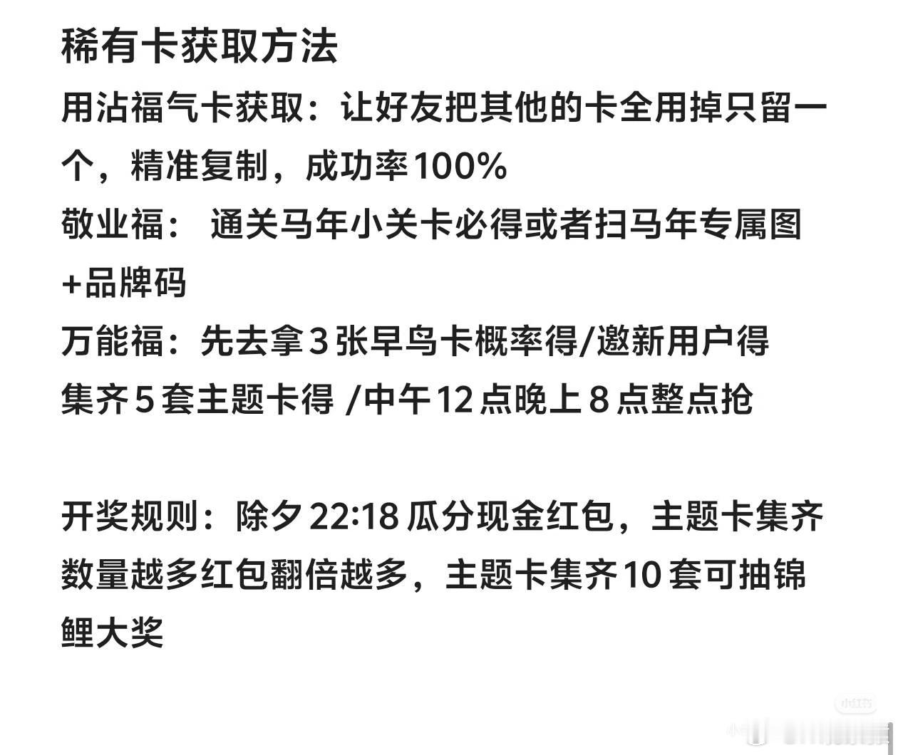 支付宝集福卡看了下,今年规则太过于复杂,可能会分的多。