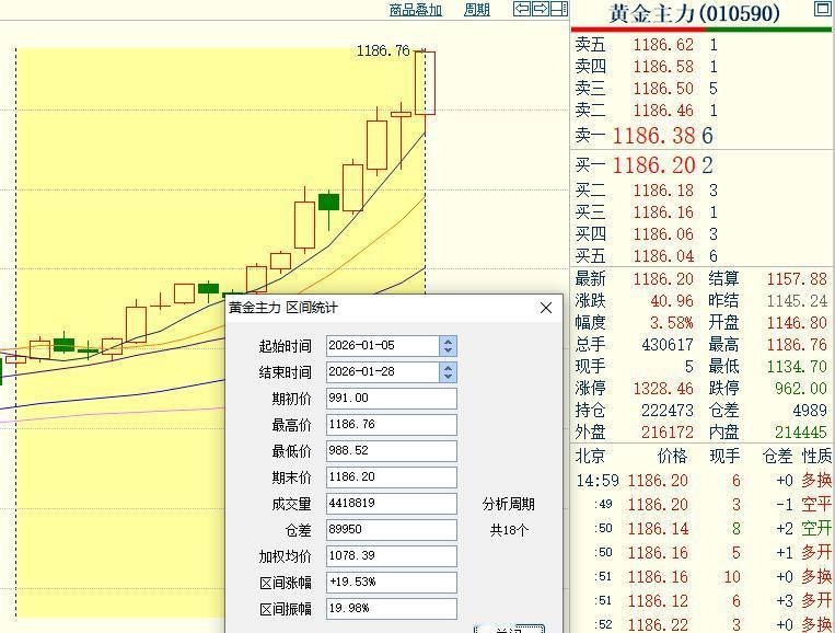 国内黄金期货 都到了1186元, 让我五味杂陈,内心久久不能安。 要知道,元旦假期后, 国内黄金期货主力合约 开盘价仅为991元/克, 元旦至今最低到了988.52元, 最高已经升至1186.76元。 短短十三个交易日, 上涨了近二百元。 这个涨幅超过去年半年, 也超过之前几年的变动。 真心理解不了,就是发生世界大战, 能有如此大的涨幅?