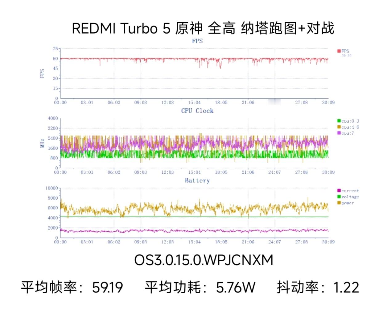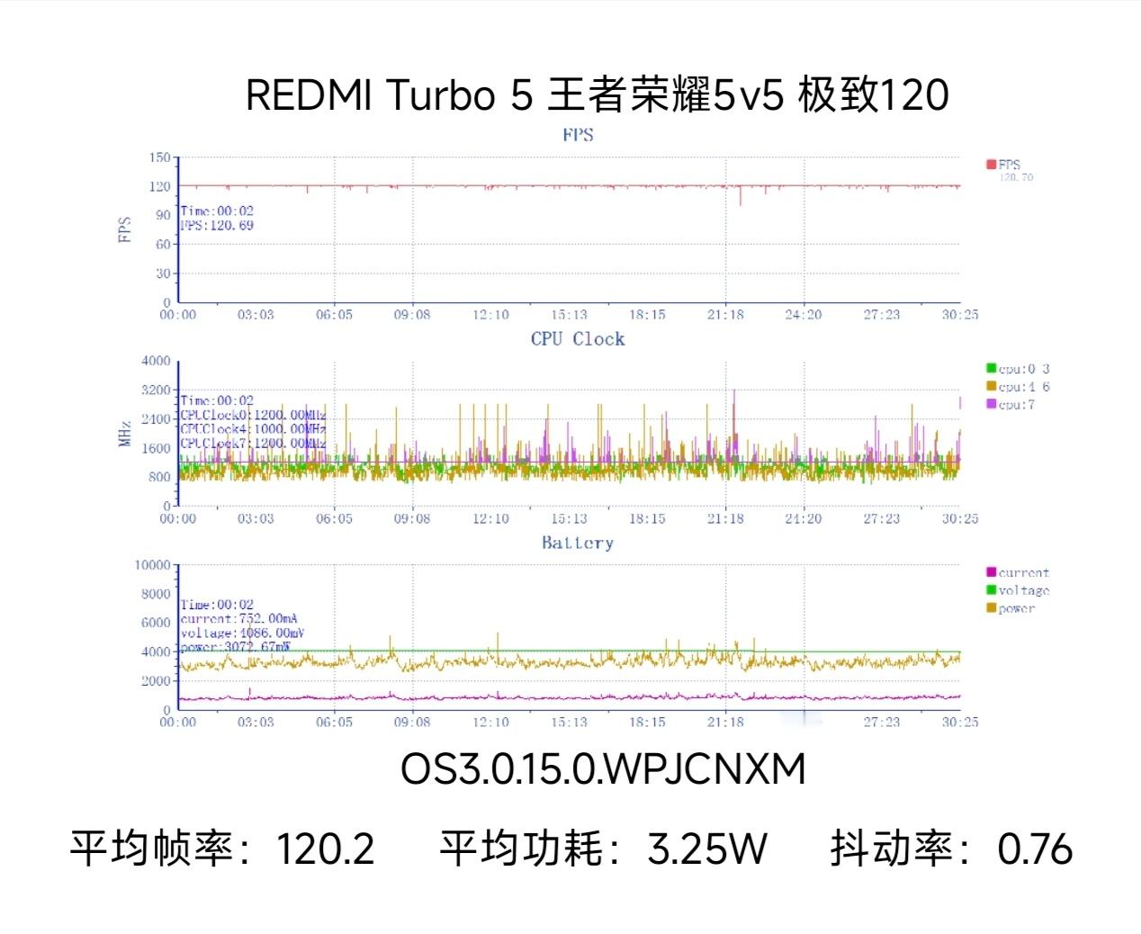 我们对 REDMI Turbo 5 标准版进行了性能测试。REDMI Turbo 5 搭载了天玑 8500-Ultra 芯片,CPU 采用 8*A725 全大核心设计,主频至高 3.4Ghz;GPU 提升较大,搭载 Mali-G720 MC8 1.5GHz,比 8400 多一个核心,峰值性能提升25%,功耗下降20%。而搭配的旗舰级 LPDDR5X Ultra+UFS4.1 内存规格也保证了 8500 这颗 SoC 无论是日常使用还是游戏场景都更加从容。性能方面,安兔兔常温跑分约 220 万,GB6单核 1650/多核 7283;而具体到实际的游戏实测数据中:王者当然是一条直线,极致画质 5v5 120.2 帧/3.25W 功耗,整体的核心响应策略是趋于保守的动态调频,超大核稳定在 1.2Ghz 左右节省能耗,遇到团战场景超大核与大核也能及时提高频点响应;和平精英也能开启流畅 120 模式,比上代只能开启 90 帧更强;测试下来 120 帧稳定一条直线,超大核与大核有着较为激进的调度策略,能较好地维持 120 满帧运行,测试全程没有大的掉帧;原神全高纳塔跑图也基本能跑满,最后的实测数据是 59.19 帧/5.76W 平均功耗,调度策略主要靠超大核和大核拉满负载,最高能跑到 2.6Ghz,小核心稳定在 800Mhz-1.4Ghz 上下,属于略激进的调度,让天玑 8500-Ultra 这颗芯片也能跑满原神。可以说,Turbo5 标准版搭载的天玑 8500-Ultra 这颗 SoC 的性能确实会比同档的 6 系/ 7 系芯片强,具体表现在全大核设计、游戏能开更高负载的模式、帧率更平滑;日常使用流畅度也更有保证;王者/吃鸡/原神等游戏都能满帧畅玩,是一颗体验优秀、差异化做得很好的中高端芯片。感兴趣的朋友们,欢迎来上手实测看看~Turbo5首发测评