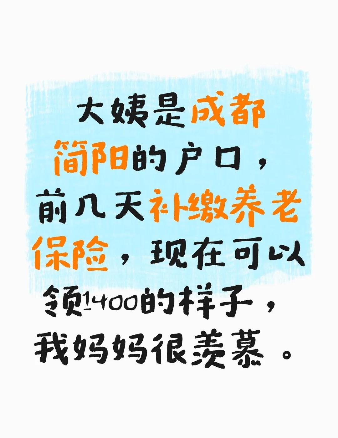 大姨是成都简阳的户口,前几天补缴养老保险,现在可以领1400的样子,我妈妈很羡慕。 大姨是结婚上了夫家的户,落到了简阳农村,四十多岁的时候就开始逐年买,那个时候就比较有前瞻性,买的最高档,到今年刚好十五年,也刚好六十岁,挺好的前几天办了退休,现在可以领到1400,嫁到四川,吃的也多,玩的也挺多,养老金都更高[笑哭][笑哭][笑哭][笑哭]一次性补缴居民养老保险 成都落户房屋落户