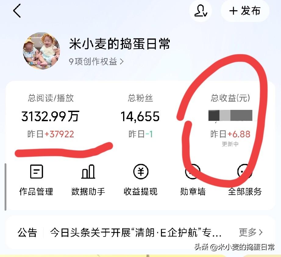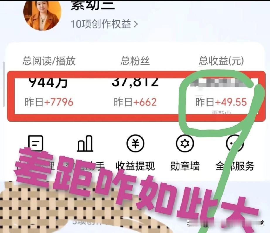 头条人与人的差距! 我的头条37922的阅读量,收益才6.88块, 素老三只有7796阅读,收益却高达49.55块。 他阅读量是别人的5倍,收益却只有人家的1/7。这差距,比我和王思聪的存款差还离谱! 我点进他主页一看,瞬间懂了:他每天分享收益,明天发职场吐槽,后天又晒生活,啥火写啥,完全没个准谱。 素老三就不一样,人家认准一个赛道深耕,粉丝都是精准受众,每一个阅读都能变现。 这哪是运气差?这就是“内容垂直”四个字的碾压!别再瞎写了,聚焦一个领域,让算法记住你,让粉丝认准你,收益才能跟着起飞。